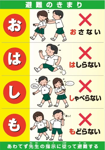 오(お)는 오사나이(おさない 밀지 않는다), 하(は)는 하시라나이(はしらない 달리지 않는다), 시(し)는 샤베라나이(しゃべらない 말하지 않는다), 모(も)는 모도라나이(もどらない 돌아오지 않는다)라는 머리글자로 한신·아와지 지진 이후 소방청에 의한 교육안전지도 가이드라인에 소개됨에 따라 방재교육의 표어로서 전국에 보급됐다. 처음에는 젓가락을 의미하는 오하시(おはし)였지만 쓰나미 대피 원칙인 모도라나이(もどらない | 돌아오지 않는다)의 모(も)가 뒤에 추가되었다.