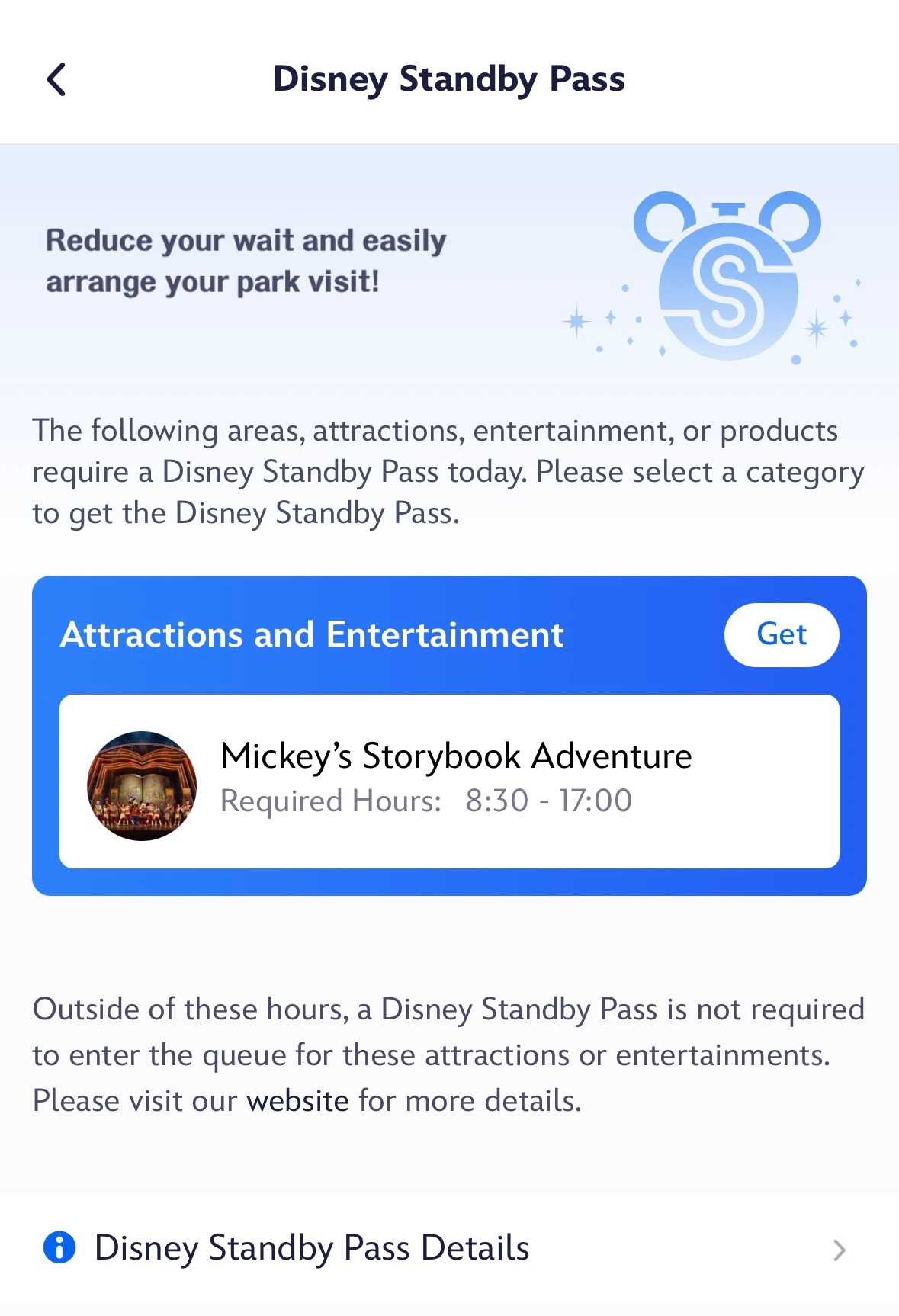 Show Time을 확인 후 Standby Pass Required에서 Get을 클릭