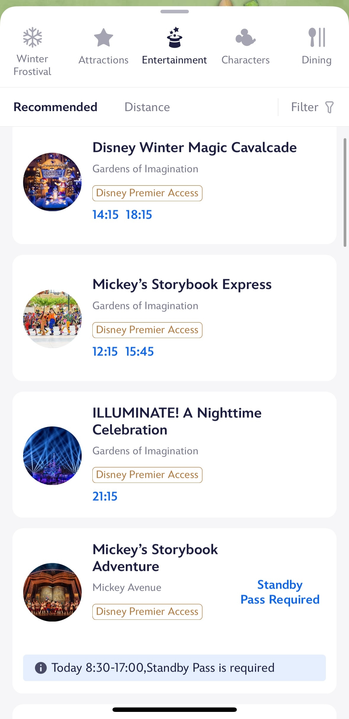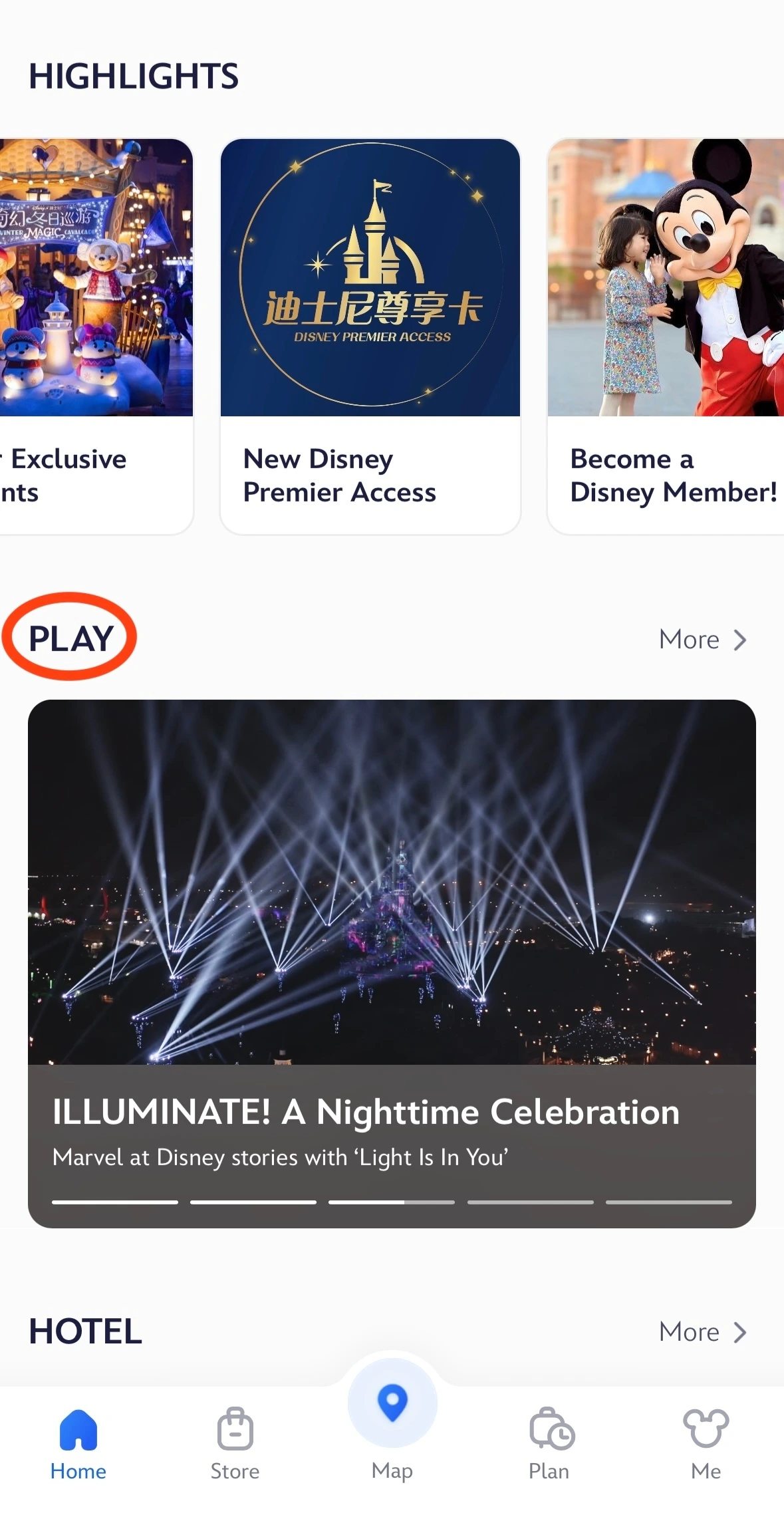 불꽃놀이 시간은 디즈니랜드 어플 홈 화면에서 아래로 스크롤하면 나오는 PLAY > ILLUMINATE에서 확인할 수 있다.