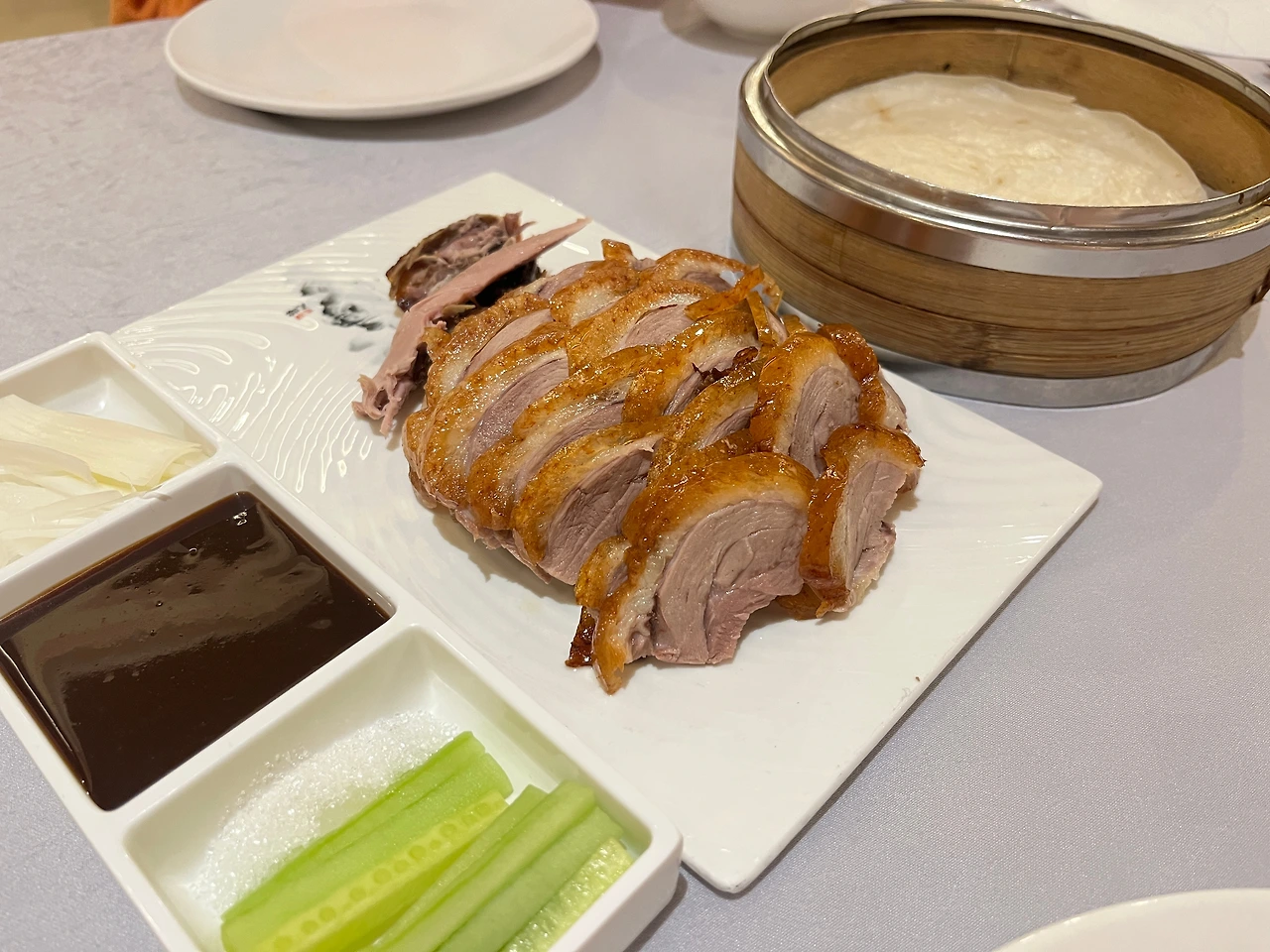 두 명이라 반 마리 주문했다. 먹다보면 물려서 반 마리가 적당했다. 밀전병과 사이드 디시는 따로 추가해야 한다. 하얀 밀전병에 고기랑 오이, 파를 얹어서 춘장 소스에 찍어 먹으면 된다. 소스가 킥이다.