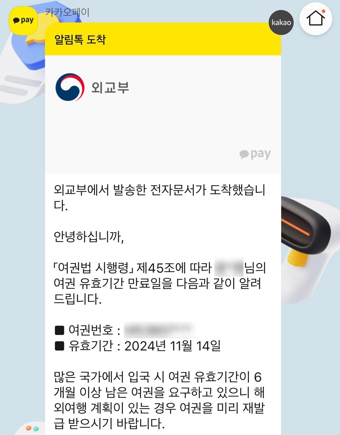 5개월 전에 카카오톡으로 외교부에서 여권 유효기간 만료 알림이 왔다. 바빠서 갱신을 미루고 미루다 여권 만료일이 정말(!) 얼마 남지 않음을 깨닫고 급히 일본에서 여권을 재발급했다. 발급까지 통상 3주 정도 소요되니 미리미리 발급받는 것을 추천한다.