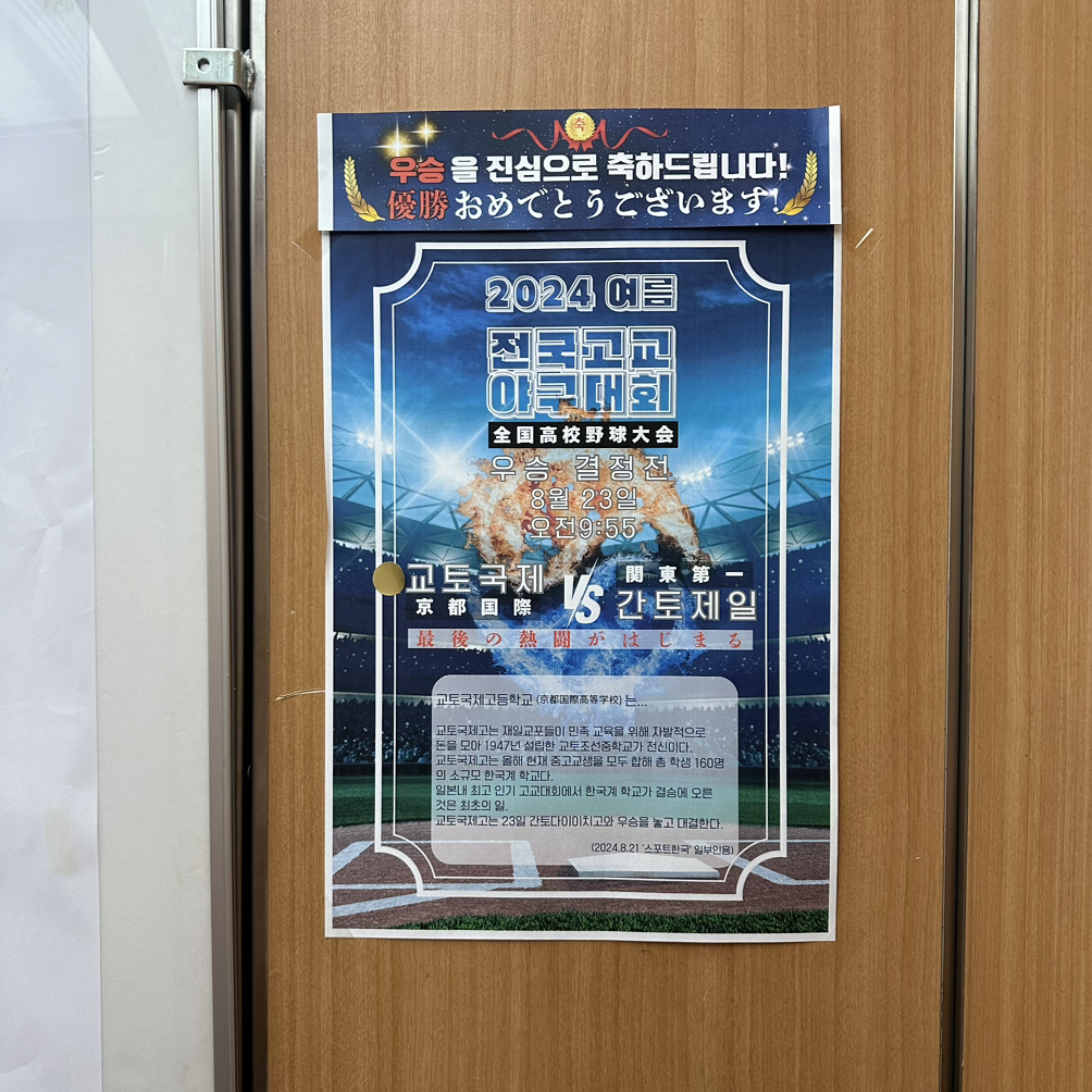 여담이지만 올해 일본 전국고교야구대회(甲子園)에서 한국계 학교인 교토국제고등학교가 우승해서 한국에서도 큰 화제였다. 아직도 우승을 축하하는 현수막이 아직도 영사부 내 곳곳에 붙어 있었다. 괜히 뿌듯하구만..