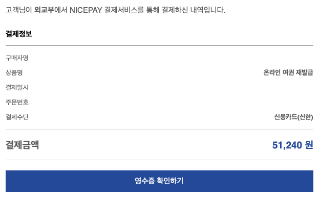 국내 신용카드로 결제했고 총 51,240원을 결제했다.