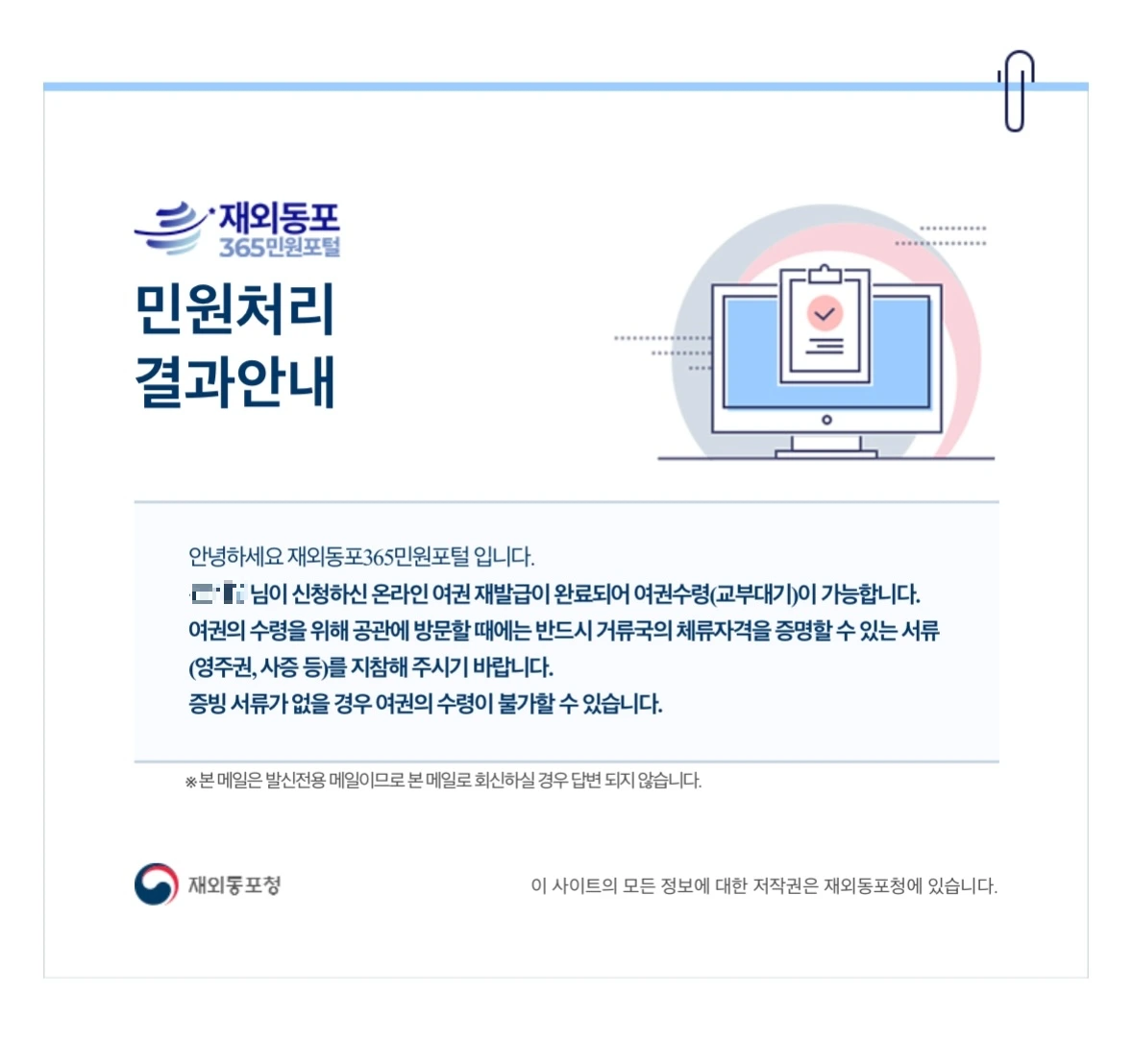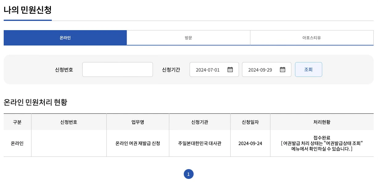 결제가 완료되면 온라인 여권 재발급 신청 처리현황을 나의 민원신청에서 확인할 수 있다. 여권발급 처리 상태는 여권발급상태 조회 메뉴에서 확인할 수 있다.