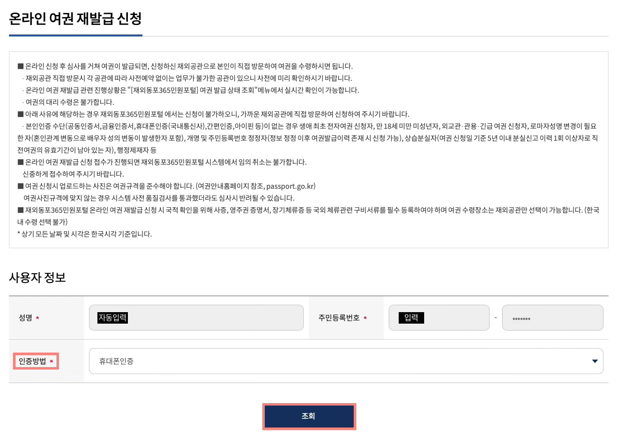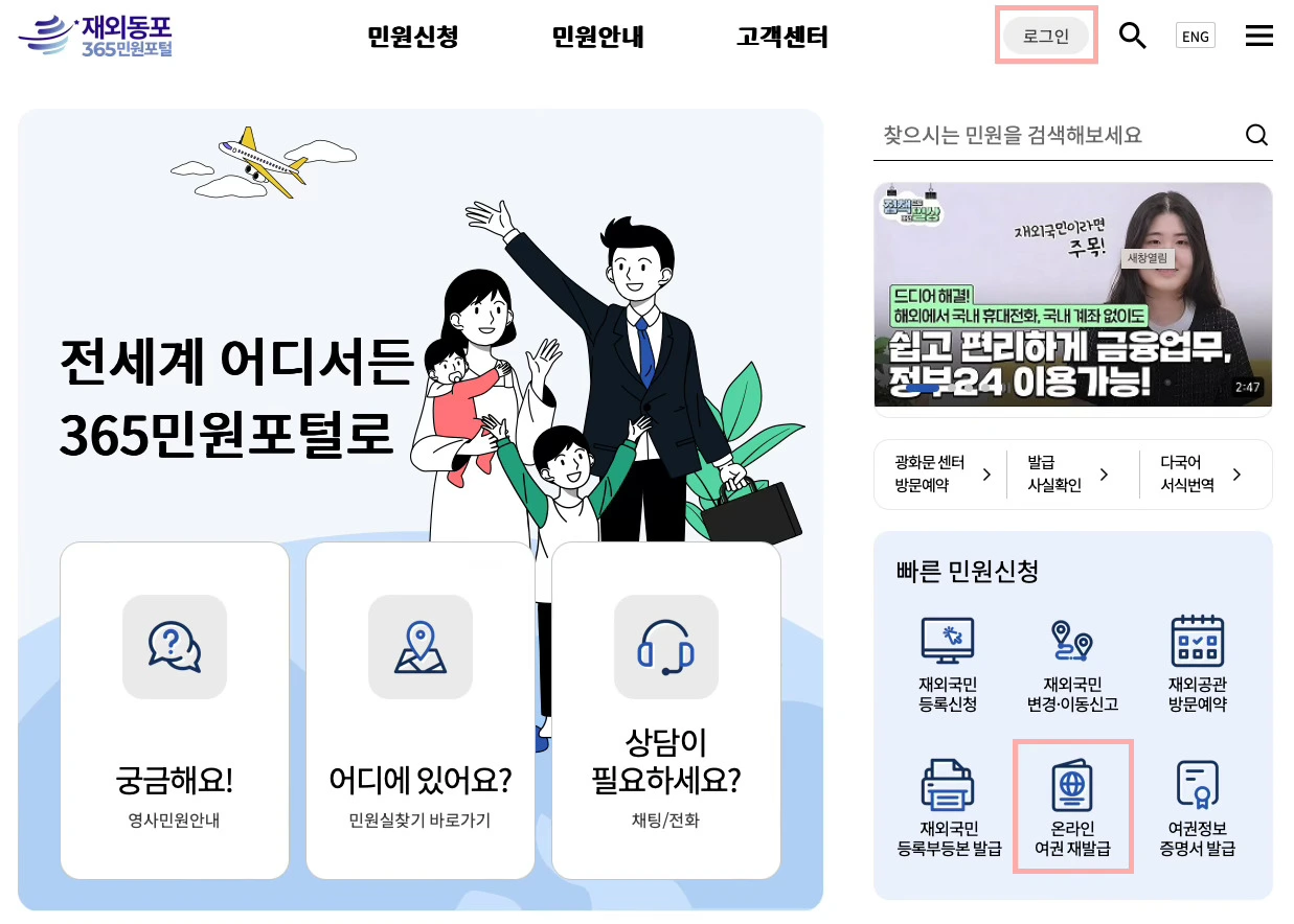 여권 재발급은 온라인 신청과 대한민국 영사부를 방문해 발급하는 두 가지 방법이 있다. 직접 영사부에 방문하는 건 평일 운영 시간에 맞춰서 가야 하고 대기시간도 있을 것 같아 편하게 온라인으로 신청했다. 온라인 신청은 아래 재외동포365 민원포털에서 신청이 가능하다.