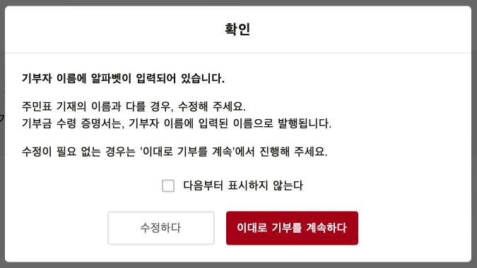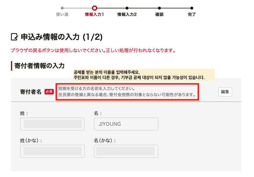 주문을 할 때는 반드시 주민표에 기재되어 있는 이름과 주소를 주문자 정보로 등록해야 한다. 만약 주민표에 영문 이름으로 기재가 되어 있다면, 신청 시 기부자 이름도 반드시 영문으로 입력해야 한다.