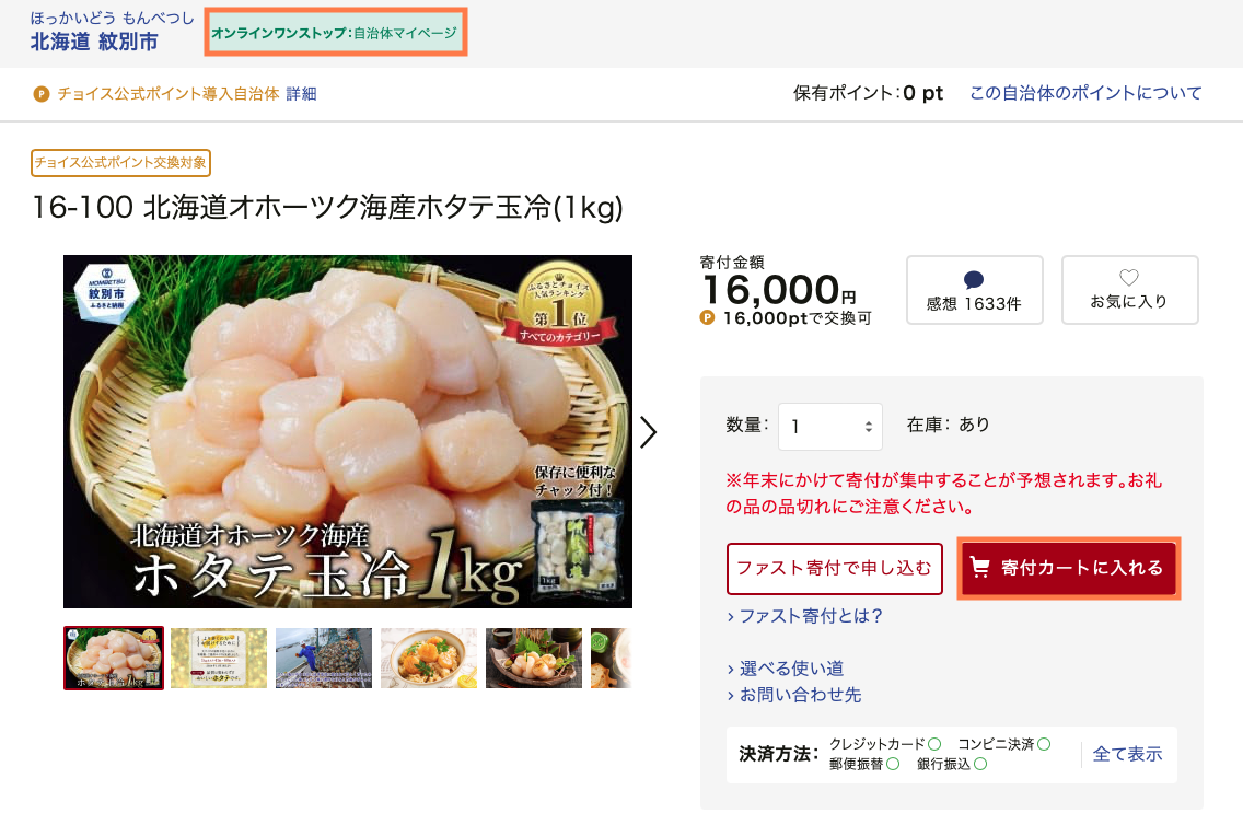 기부하고 싶은 지역의 답례품을 골랐다면 신청해 보자. 후루사토 초이스의 경우 페이지 상부 지자체명 옆에 온라인 원스톱 신청 가능 여부가 기재되어 있다.