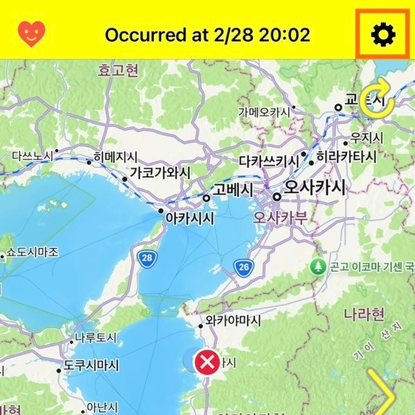 우선 가장 중요한 긴급 지진 속보 알림을 설정하기 위해 Yurekuru Call에 접속 후 오른쪽 상단의 톱니바퀴 마크를 눌러 설정 화면으로 이동한다.