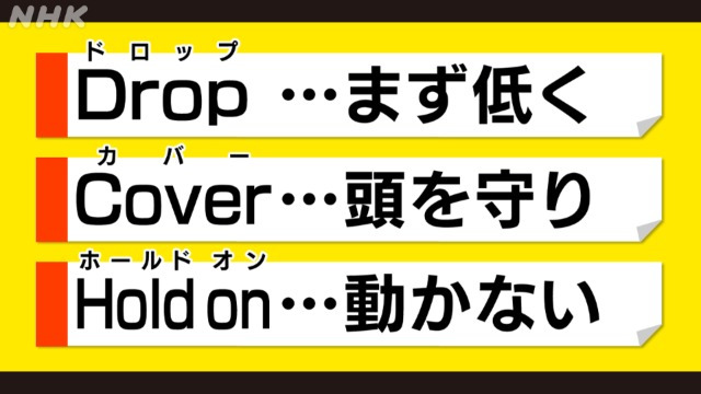 Drop(드롭/우선 낮게), Cover(커버/머리를 지키고), Hold on(홀드 온/움직이지 않는다)