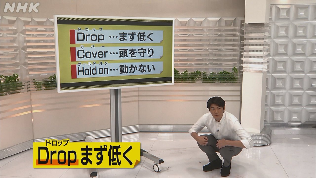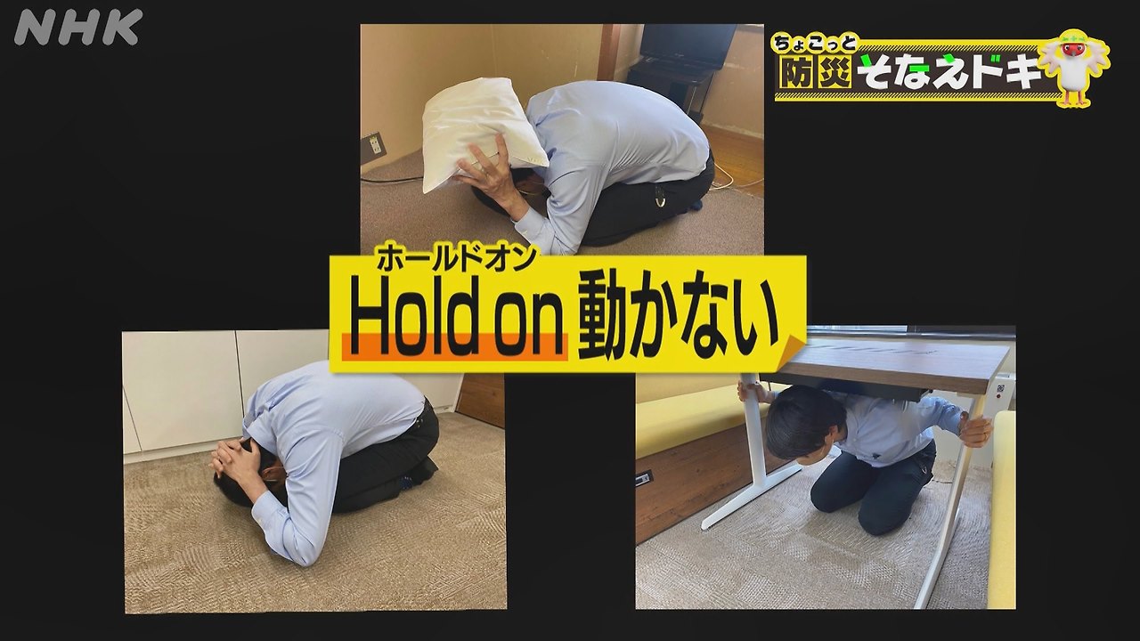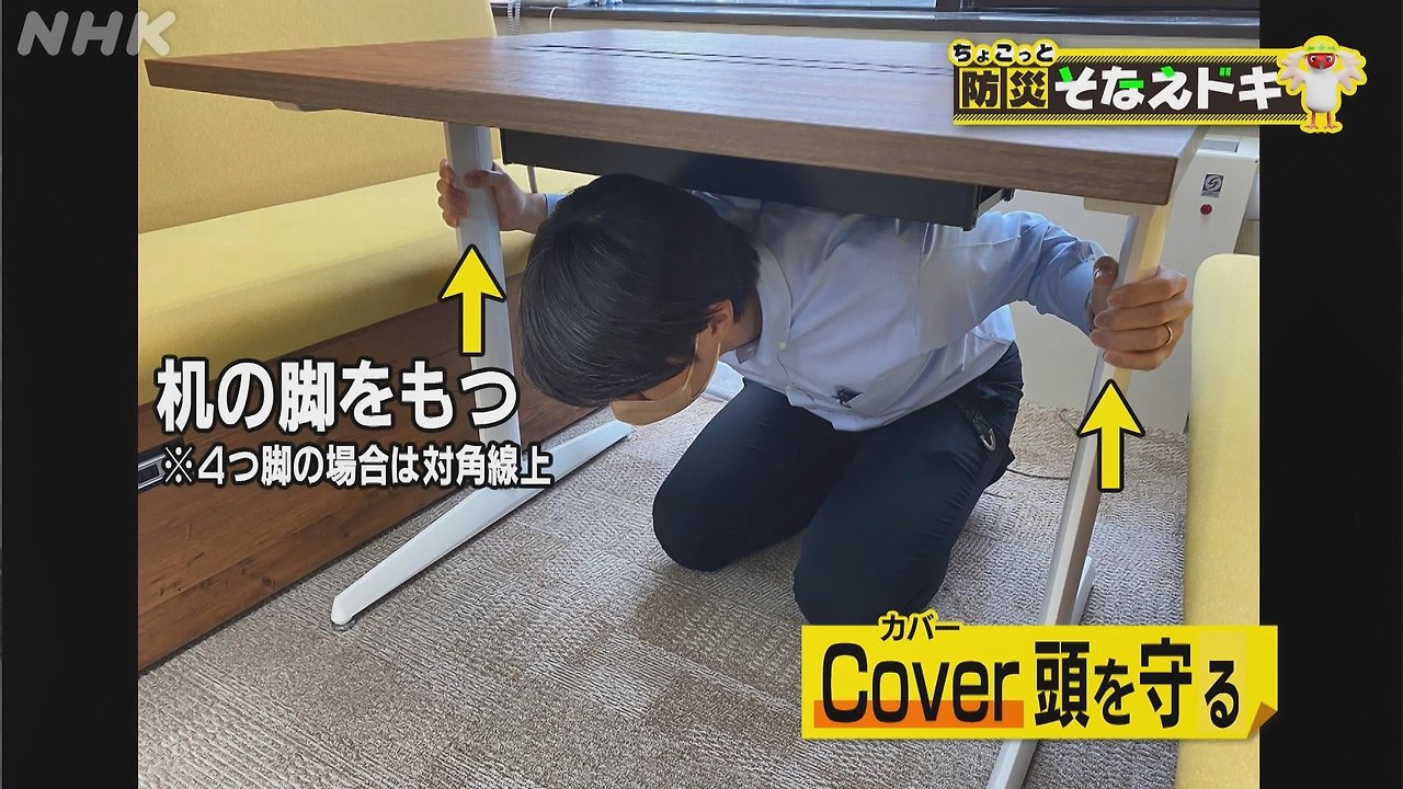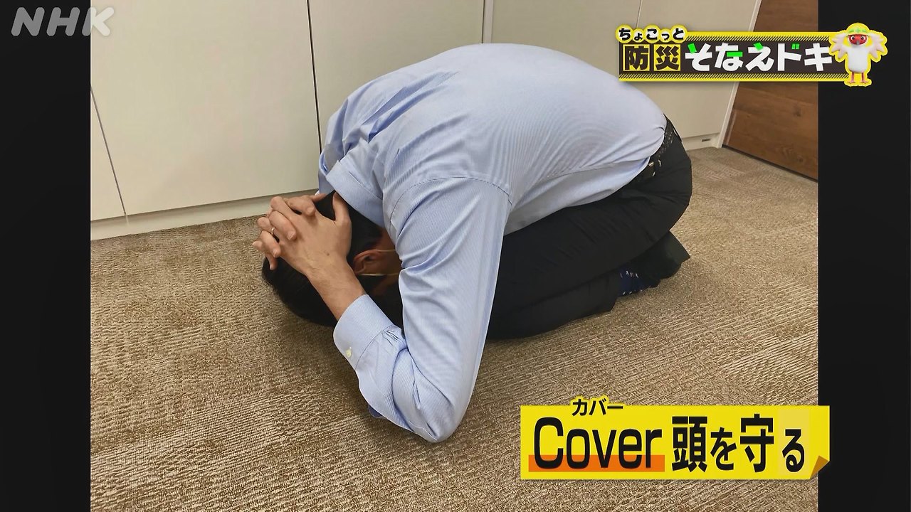 책상이 없으면 헬멧을 쓰는 것이 이상적이지만, 없으면 방석이나 베개로 머리를 지키고 몸 전체로 배를 보호한다. 머리나 배에 부상을 입으면 움직일 수 없게 되기 때문이다. 출퇴근 중이나 등교 중이라면 가방이나 책가방 등을 사용한다. 아이가 있는 경우에는 어른이 몸을 덮어 준다.