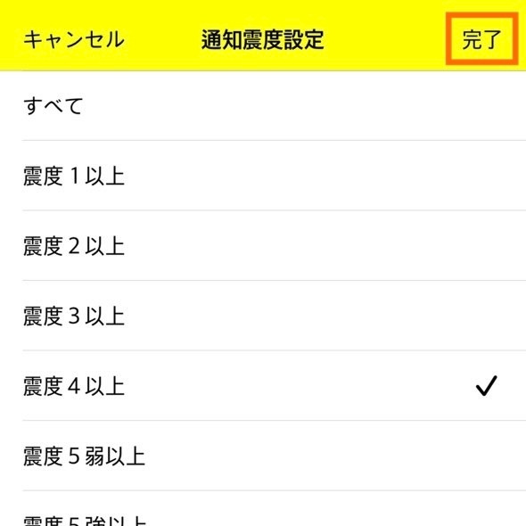 이때 통보 진도 설정을 함께 할 수 있다. 긴급 지진 속보는 최대 진도가 진도 5약 이상으로 예상된 대지진의 경우에만 전달되는데, 몸에 느껴지는 지진경보를 모두 수신하고 싶다면 '진도 2~3 이상', 물건이 쓰러지거나 대책을 세워야 할 정도의 것만 수신하고 싶다면 '진도 3~4 이상'으로 설정해 두면 누락 없이 통보를 받아볼 수 있다.