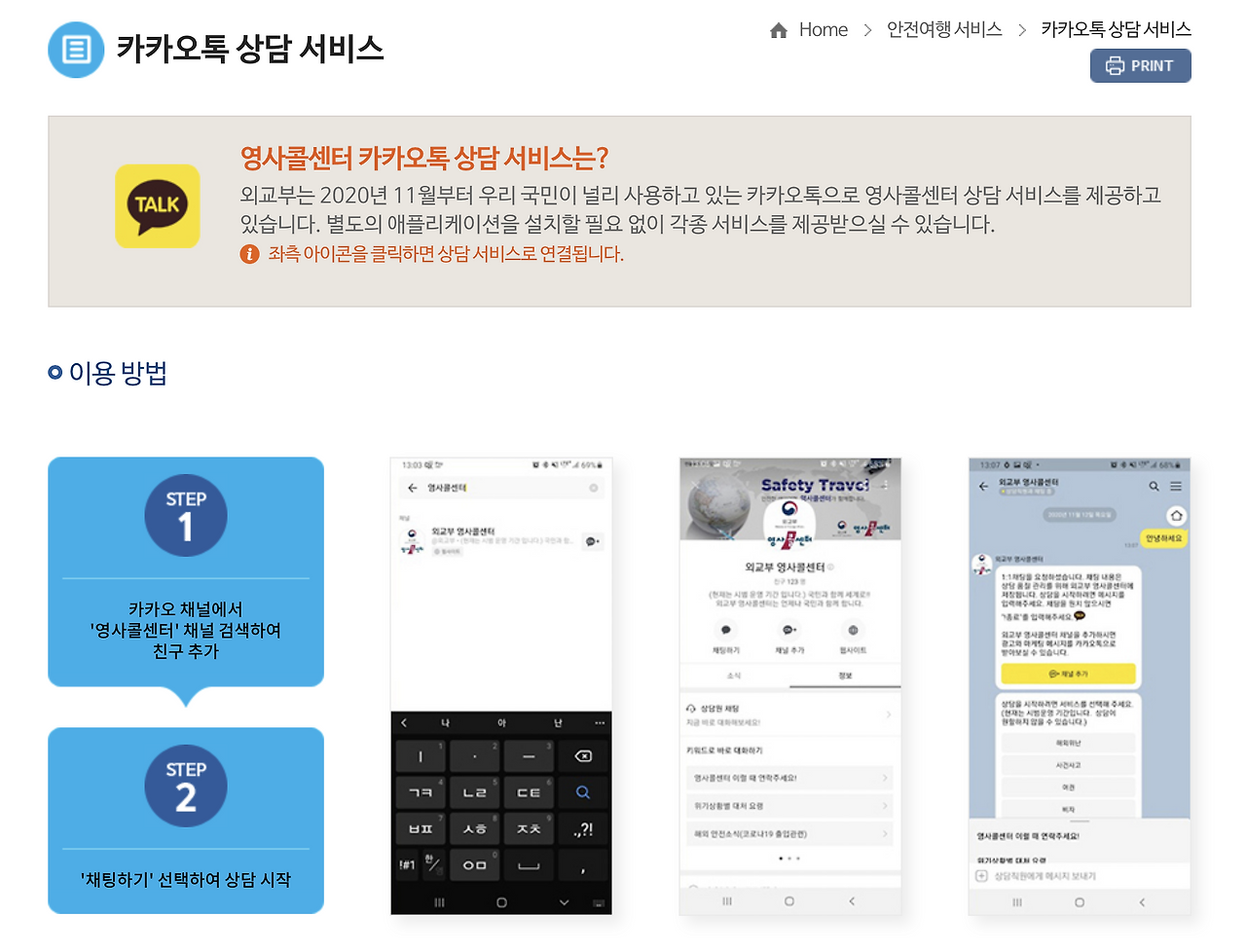 영사콜센터는 해외에서 사건·사고 또는 긴급한 상황에 처한 우리 국민들에게 도움을 주기 위해 연중무휴 24시간 상담서비스를 제공하고 있다. 2020년 11월부터는 카카오톡으로도 영사콜센터 상담 서비스를 제공하고 있다.