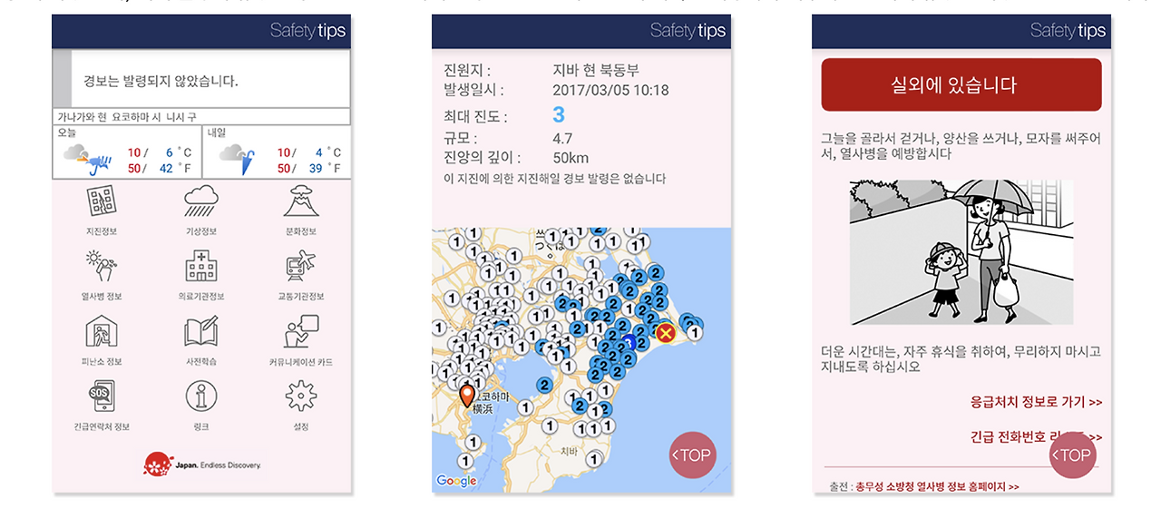 관광청이 발신하는 외국인 여행자용 푸시형 정보 발신 앱이다. 외국인 여행자를 위하여 긴급 재해정보를 외국어로 알려준다.