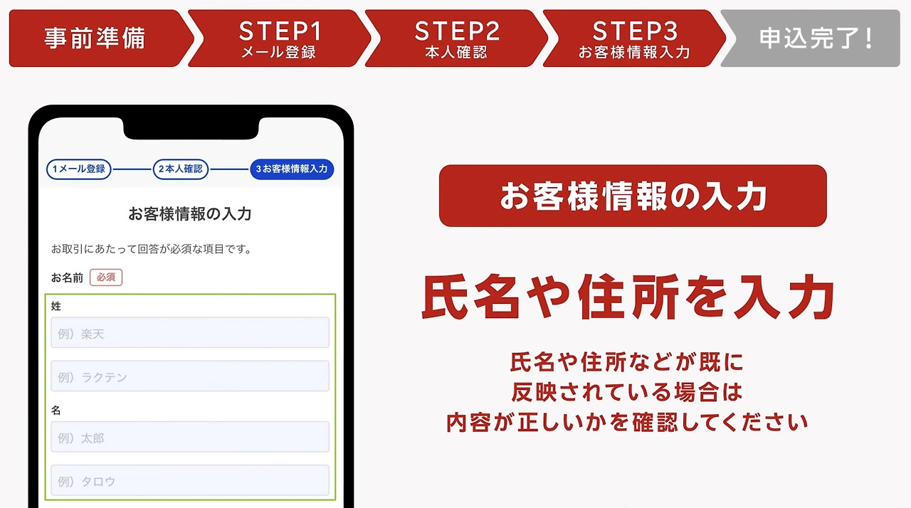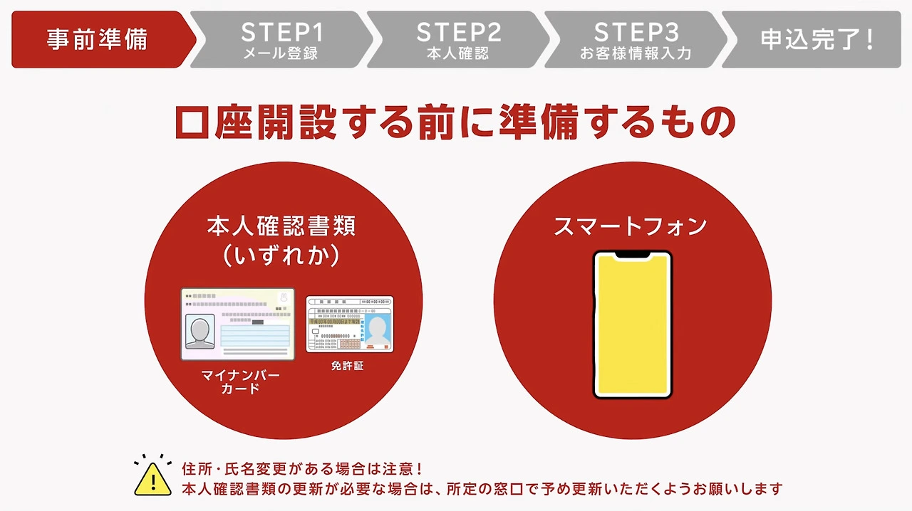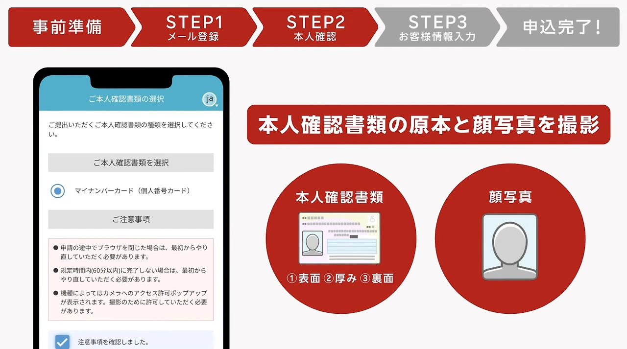 스마트폰으로 본인확인 서류를 제출한다. 마이넘버카드 실물을 스마트폰으로 촬영하고, 얼굴 사진을 찍어 제출하면 본인확인이 완료된다.