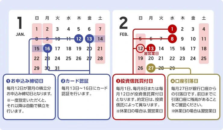 매월 12일까지 신청을 완료하면 다음 달 매수일(휴일의 경우 그다음 영업일)에 매수한 후, 27일(휴일의 경우 그다음 영업일)에 라쿠텐 카드의 인출처 은행 계좌에서 자동이체로 빠져나간다.