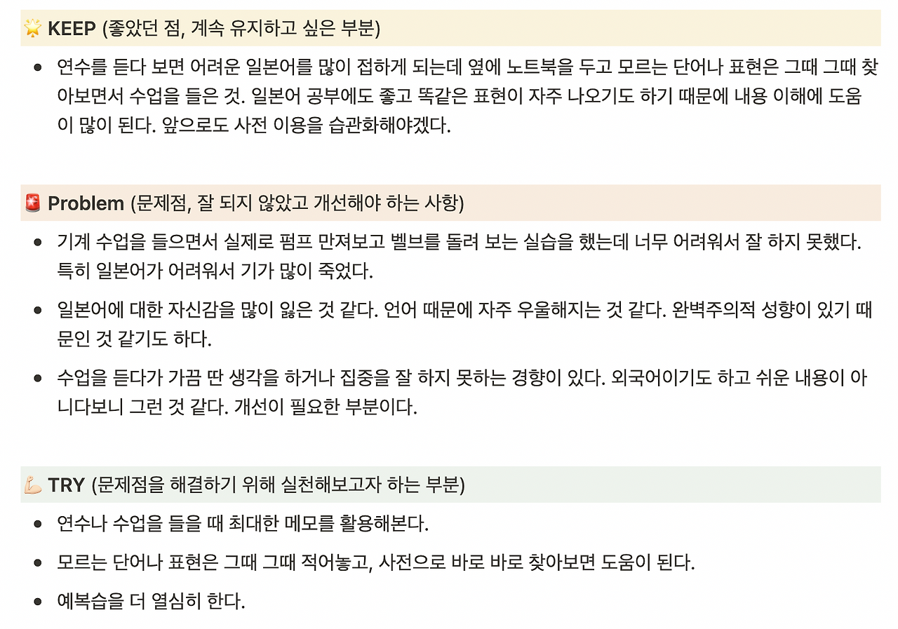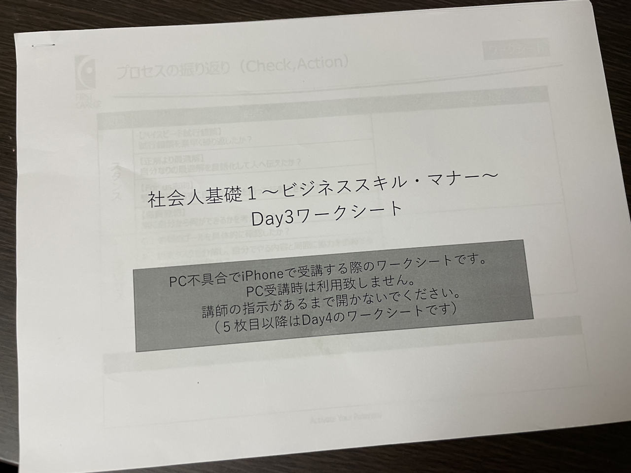 매일 연수가 끝나고 나서는 ①그날의 연수에서 배운 것(①本日の学び), ②배운 것으로부터 새롭게 깨달은 점(②学びからの気づき), ③깨달은 것이나 배운 것을 앞으로 어떻게 행동으로 옮겨 실천할 것인지(③気づきや学びを今後どのように行動に活かすか)를 쓴 일지(日報)를 제출해야 했다.