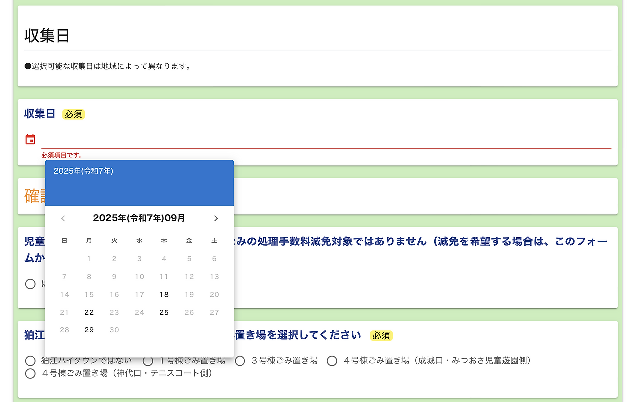 마지막으로 수거일을 지정하면 완료! 어느 지자체나 일정 요건에 해당하는 경우 배출 수수료가 면제되는데, 고마에시의 경우 쓰레기 배출 수수료 감면 대상은 이 폼에서 신청이 불가하다고 하니 참고할 것✔