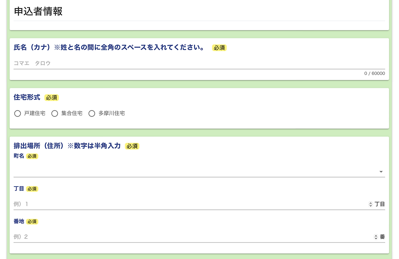 신청자 정보를 입력한다. 이름을 입력하고 주택형식과 배출 장소를 선택한다. 주택형식에서 戸建住宅은 단독주택, 集合住宅은 공동주택을 의미한다.