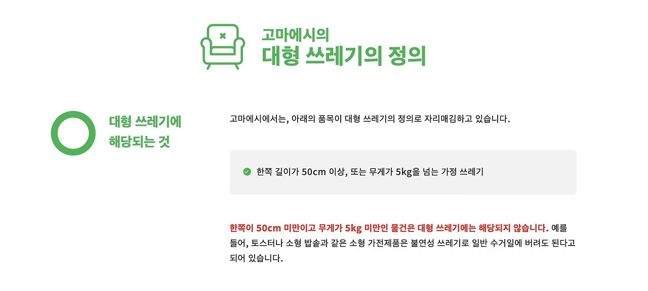 지역에 따라 대형 쓰레기의 정의가 상이하니 본인 거주지의 배출 방법을 확인할 필요가 있다. 검색창에 본인이 살고 있는 지역명+粗大ゴミ(소다이고미)를 검색하면 쉽게 찾을 수 있다.