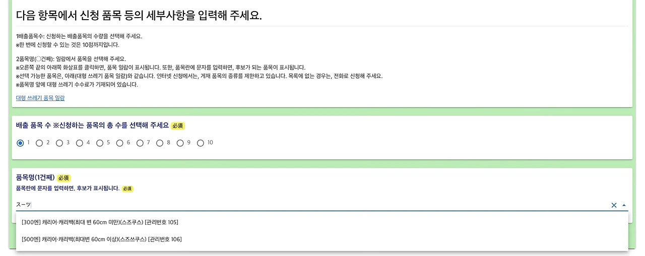 한 번에 10개까지 배출 신청이 가능하다. 배출할 물건의 수량과 품목을 선택한다. 나는 이번에 큰 캐리어를 처분할 생각이라 캐리어를 선택했다.(캐리어는 일본어로 スーツケース 또는 キャリーバッグ라고 한다.) 최대변이 60cm 미만일 경우 300엔, 60cm 이상일 경우 500엔이다.