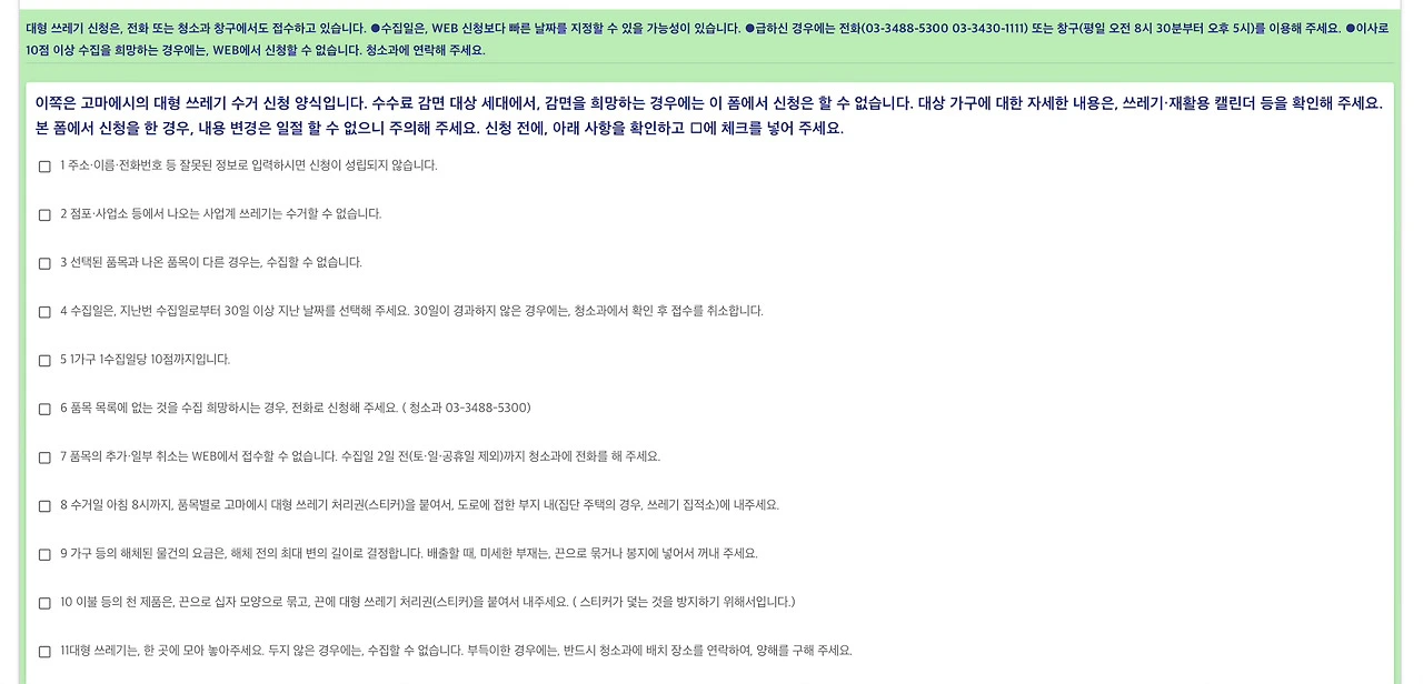 쓰레기 수거 양식 폼이다. 신청 전에 주의 사항을 확인하고 체크한다.