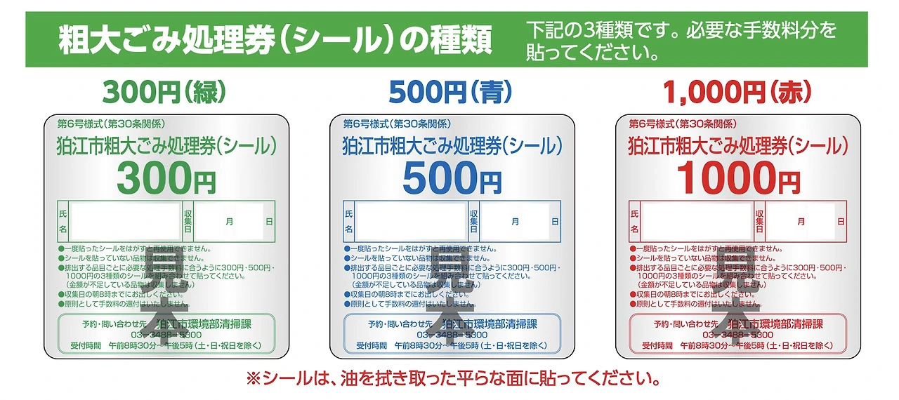 대형 쓰레기 처리권은 거주지 근처 편의점이나 슈퍼에서 구입할 수 있다. 고마에시의 경우 300엔(녹색), 500엔(파란색), 1,000엔(빨간색)의 3종류의 대형 쓰레기 처리권이 있다. 처리권에 수집일과 이름을 기재하고 수거 대상 물품의 눈에 띄는 곳에 붙이면 된다.