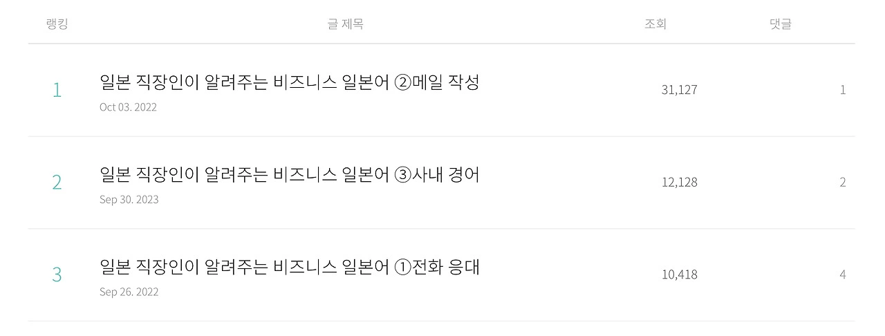 지금껏 브런치에는 50여 편의 글을 올렸는데, 가장 많은 조회수를 기록한 글 1위부터 3위까지는 모두 ‘일본 직장인이 알려주는 비즈니스 일본어 시리즈’다. 새삼 일본어에 관심 있는 사람이 많다는 걸 실감했다.
