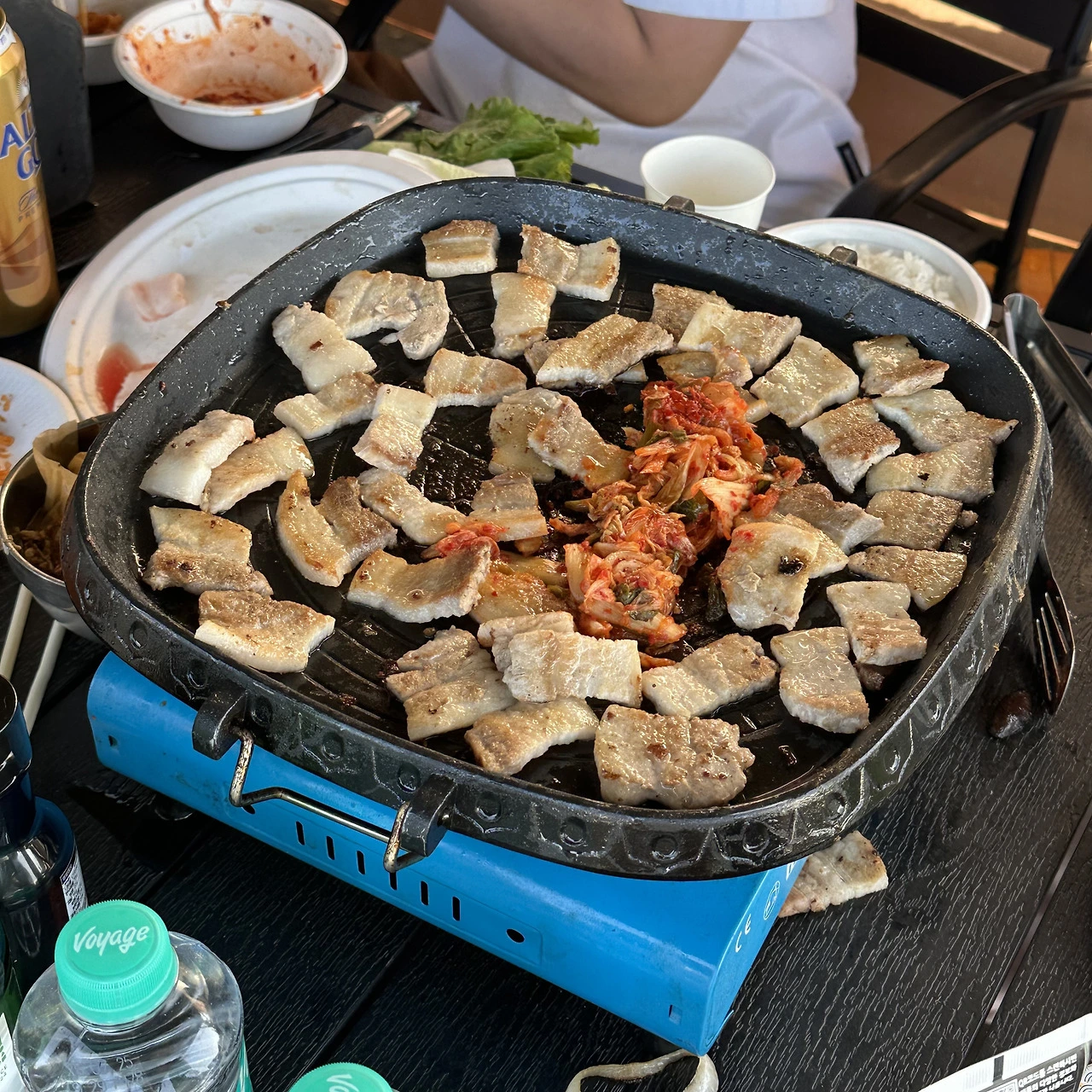 승마 체험 하고 다시 숙소로 돌아와 저녁 준비를 했다. 몽골은 우리나라와 다르게 돼지고기가 비싼데 투어사에서 특식(!)으로 삼겹살을 제공해 주셨다. 삼겹살에 비빔면은 못 참지.. 고기 담당은 나랑 재원이!