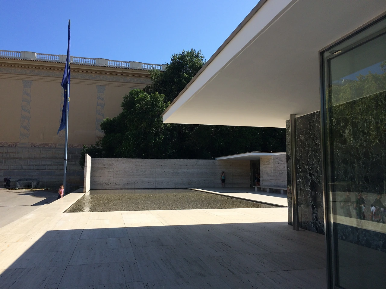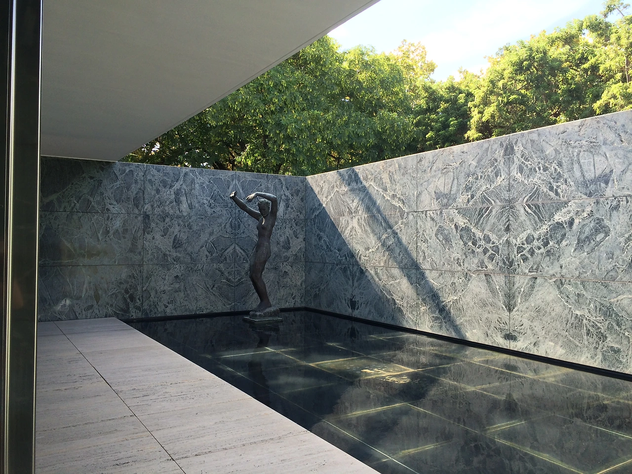 몬주익 공원 옆에는 바르셀로나 파빌리온이라는 현대 건축물이 있다. 웅장하고 화려해 관광객들로 붐비는 몬주익 성과 크게 대비되는 이 곳은 눈에 잘 띄지 않을 만큼 바닥에 낮게 엎드려 있다. 1929년 바르셀로나 박람회의 독일관으로 지어졌다가 철거되었지만 이후 작품으로서 가치를 인정받아 다시 조립되었다고 한다. 입구에는 주변의 소음을 모두 머금으려는 듯 얕고 넓은 물이 차분하게 흔들렸다. 막힌 공간이 없이 안과 밖의 경계가 모호하다. 바닥, 기둥, 지붕이 공(工) 자의 가장 단순한 형태를 하고 있음에도 불구하고 묘한 숭고미에 압도 당했다. 네덜란드 출신 현대건축가 미스 반 데어 로에는 'Less is more.'라는 말을 한 사람으로도 유명하다. 그는 원기둥에서조차 군더더기를 빼고 하중을 견디는 가장 최소한의 면적인 십자 모양만 남겨서 기둥을 세웠다. 차가운 트래버틴 바닥에 주저앉아 잠시 숨을 고르니 알맞은 바람과 8월의 녹음이 상쾌했다.