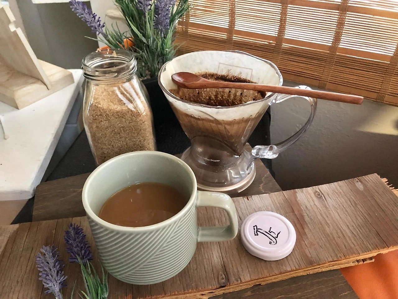 내 마음속이 부글부글 끓던 것은 못생긴 모습이었는데 원두가 소복하게 솟아오른 모습은 이쁘고 참 뿌듯하다. 위에 뽀얗게 오른 커피 거품이 참 좋다. 흑설탕을 넣고 오트 밀크를 쪼록 부어주면 완성.