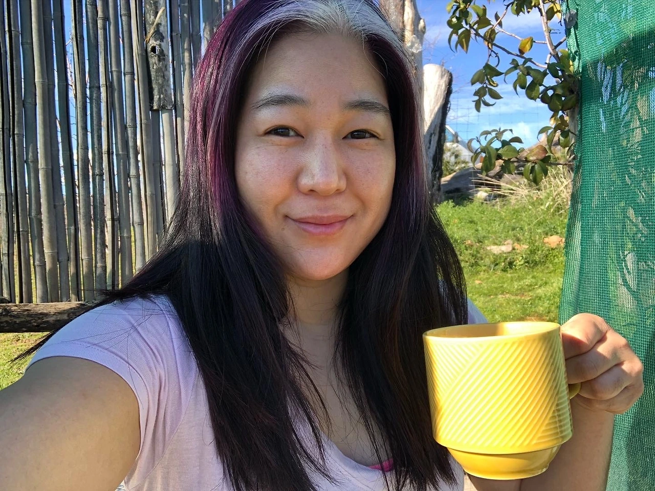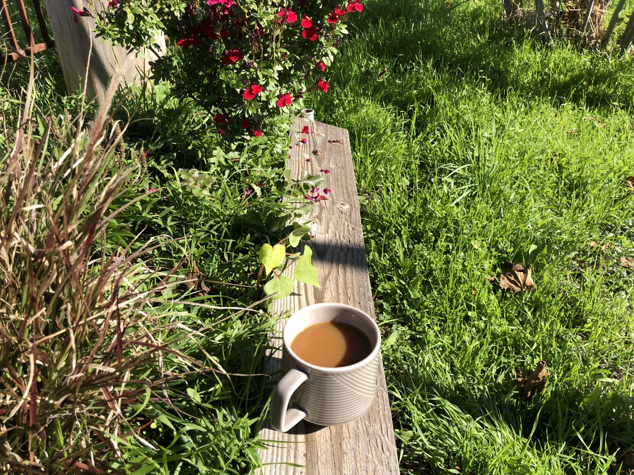 옆에 둔 노란 컵에는 컵을 데우기 위해 부어놓은 뜨거운 물이 다소곳이 담겨있다. 이 물로 컵이 충분히 데워지면 물을 따라버리고 커피 틀을 올린다. 쪼르륵- 하고 막힌 숨 트이듯 급하게 쏟아지는 커피 소리가 또 힐링이다. 커피가 가득 차면 흑설탕 세 스푼과 오트 밀크 약간을 넣어 완성한다. 색만 봐도 맛있는지 없는지 알 수 있다. 이 뜨거운 컵을 들고 정원에 나가 온갖 꽃이 만발하는 자연을 느긋하게 감상한다.