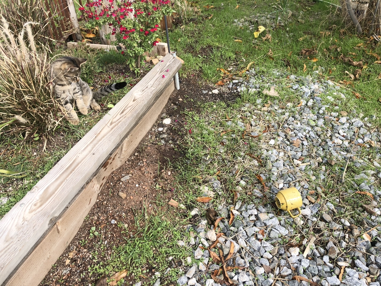 이때, 또 그 진상 손님이 슬슬 다가온다. 이 손님은 내가 먹는 것을 반드시 확인해야 직성이 풀린다. 남편이 나 앉으라고 화단에 좁게 대준 나무에 컵을 뒀는데 좀 불안하다. 저 진상 손님, 난동 안 부려야 할 텐데…