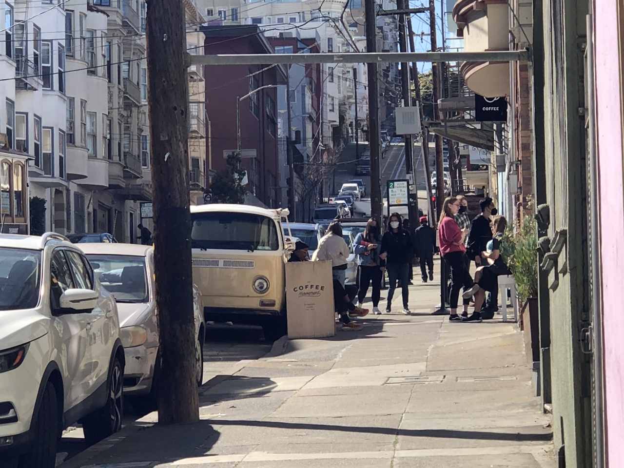 분명 한가한 집이었는데 마스크 착용 규제가 풀리고 사람들은 집 밖의 자유를 마음껏 누리는지 근처 레스토랑, 바, 커피숖 모두 사람들로 가득하다. 이 라인에 서 있다가 특이한 내 머리 때문에 날 알아본 한 사람과 대화도 나누었다.