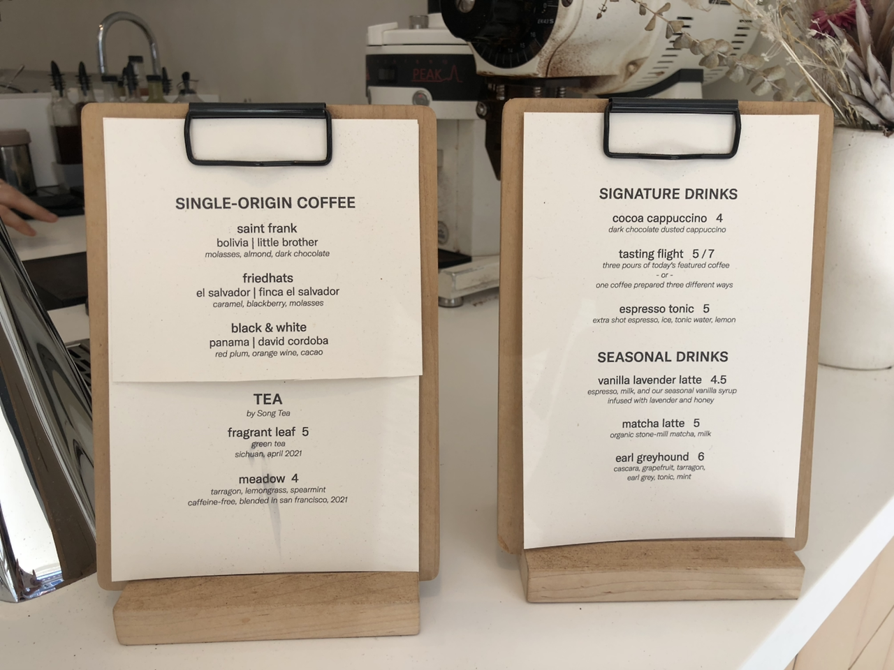 이 가게는 Single Origin 커피 전문점으로 고퀄리티의 원두로 차별화된 맛을 낸다. 원두는 남아메리카 원산지와 에티오피아 원산지가 있는데 원두는 남아메리카 쪽의 원두가 훨씬 많고 카카오 닙스를 섞어 맛이 아주 독특하다. 특히 이 커피는 식어도 맛이 좋고 크리머와 단 것을 적절히 섞어 아이스커피로 마시면 더더욱 맛있다.