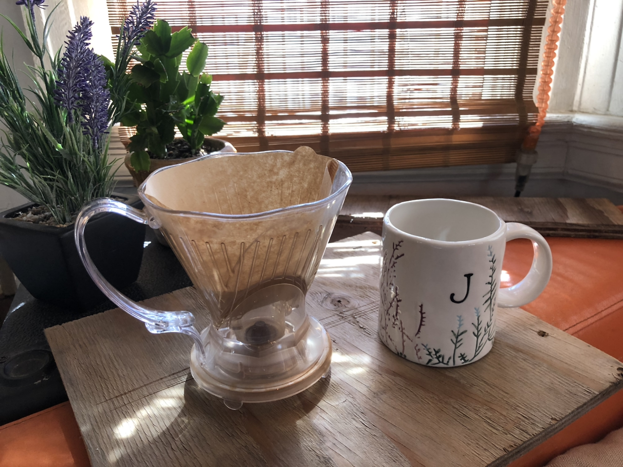 원두 위로 물을 조심스레 붓는다. 커피가 물에 휘말리며 뽀얀 거품을 일으키는 것을 보며 희열을 느낀다. 커피물이 위까지 차오르면 이제 컵에도 물을 붓는다. 컵을 미리 데우지 않으면 커피가 금방 식는다. 물을 데울 때 반드시 컵 두 잔 분량을 물을 데우는데 보통 500ml를 데우면 딱 두 잔이 나온다.