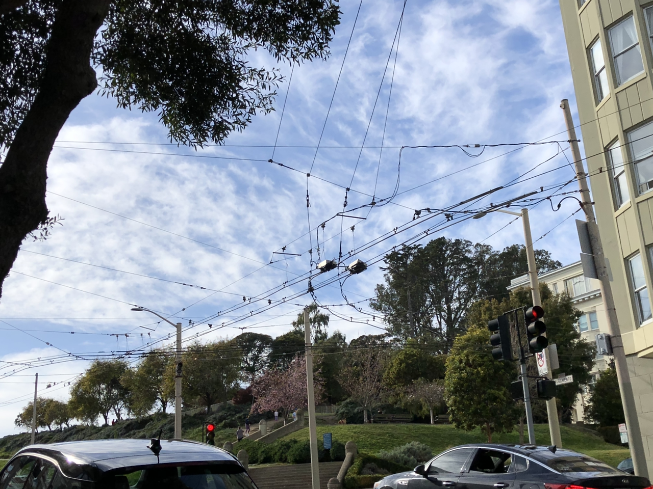 샌프란시스코를 걷다 보면 도로 위에 복잡하게 얽힌 전깃줄을 보고 놀라기도 한다. 이거 뭐가 잘못된 거 아닐까 싶을 정도로 줄들이 마구 얽혀있다. 이게 대체 뭘까? 정답은 전기로 가는 버스, 뮤니 MUNI이다.
