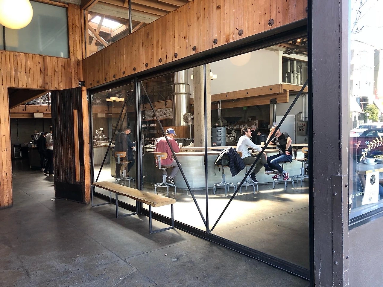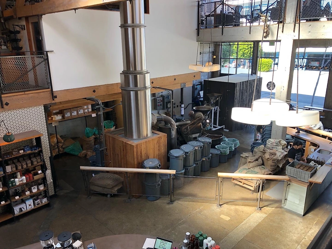 2층에서 내려다본 뷰는 정말 멋지다! 그런데 로스터에서부터의 열이 위로 올라와 머물러 윗 층에 체감할 정도로 뜨겁고 좀 정체된 공기라는 느낌이 들어 살짝 숨 막힌다는 생각이 들었다. 난간의 단석 스툴이 아니라면 내려가자, 싶어서 1층에서 내려왔다. 세상에 이렇게 좋은 카페가 있다니! 넓고 너무 쾌적하다!