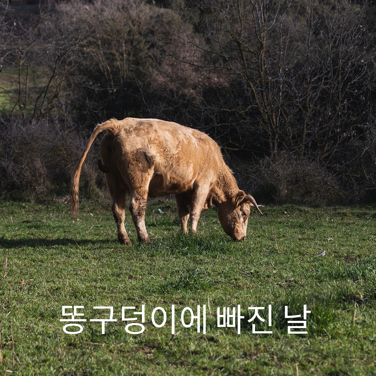 붉은 황토 위에 소들을 풀어놓고 대충 벗긴 나무로 울타리를 친 그런 시골 소 축사이다. 바닥에 톱밥이나 나무를 잘게 자른 칩 같은 것을 전혀 깔지 않아 황토는 소의 오줌과 똥과 섞여 진흙처럼 질척하다. 그것을 밟으면 철퍽- 하는 소리와 함께 질퍽한 소의 똥오줌 반죽이 발 옆으로 찍 밀려나 쌓인다. 더럽고 냄새나고 최악이다. 진 바닥을 밟는 걸 극혐 하는 나는 젖은 잔디도 밟기 싫어 돌아가는 판에 주변에 콸콸콸 오줌을 쏟아내는 소가 무신경하게 서 있는 이 환경이 참을 수 없이 싫다.