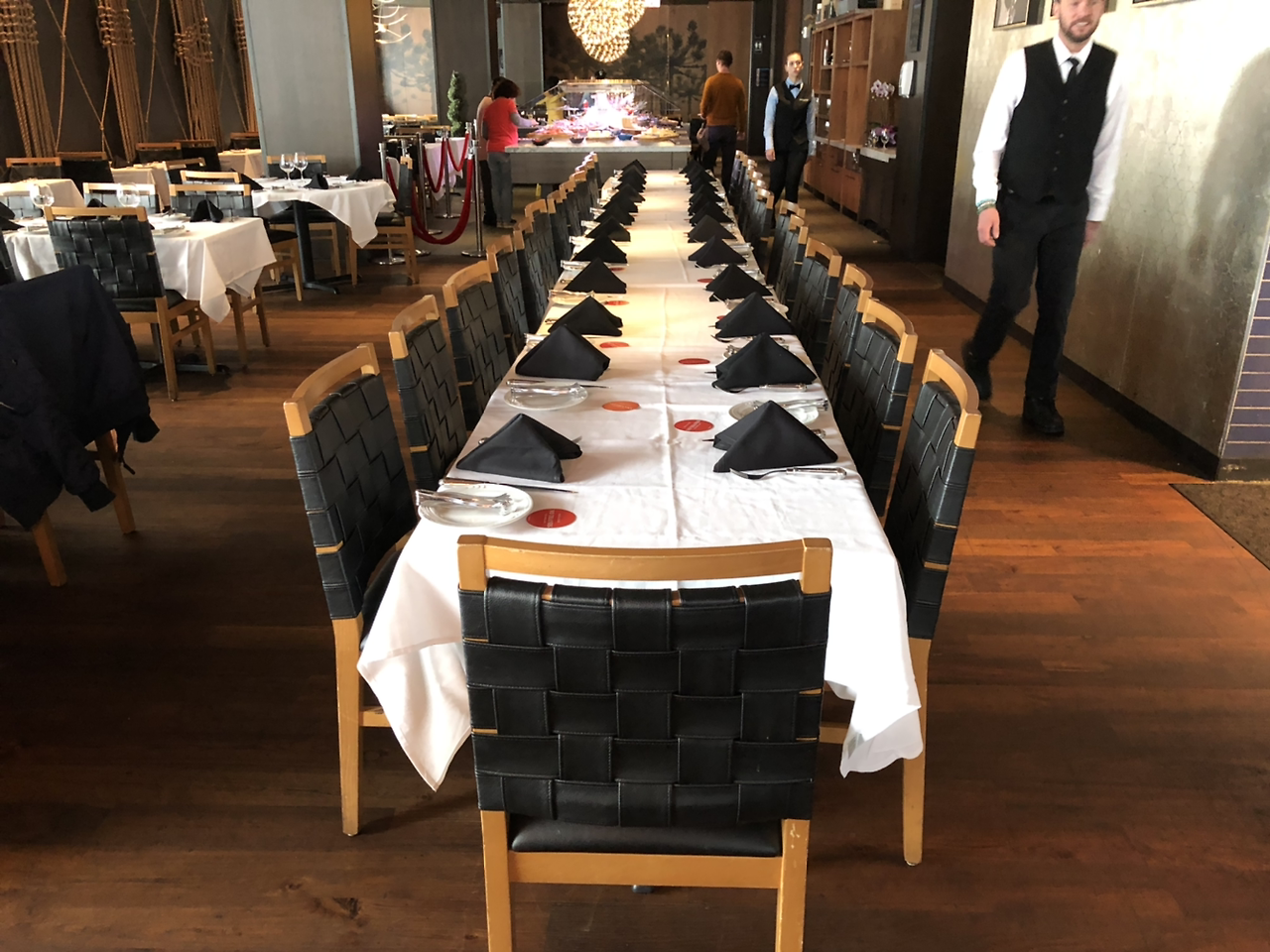 내 테이블은 끝이 안 보이게 세팅된 30명의 테이블이고 그 옆에는 18명의 테이블이 세팅이 돼있다. 이 두 단체는 같은 시간에 들어올 예정이라 나는 마음이 무척이나 바쁘게 돌아갔다.