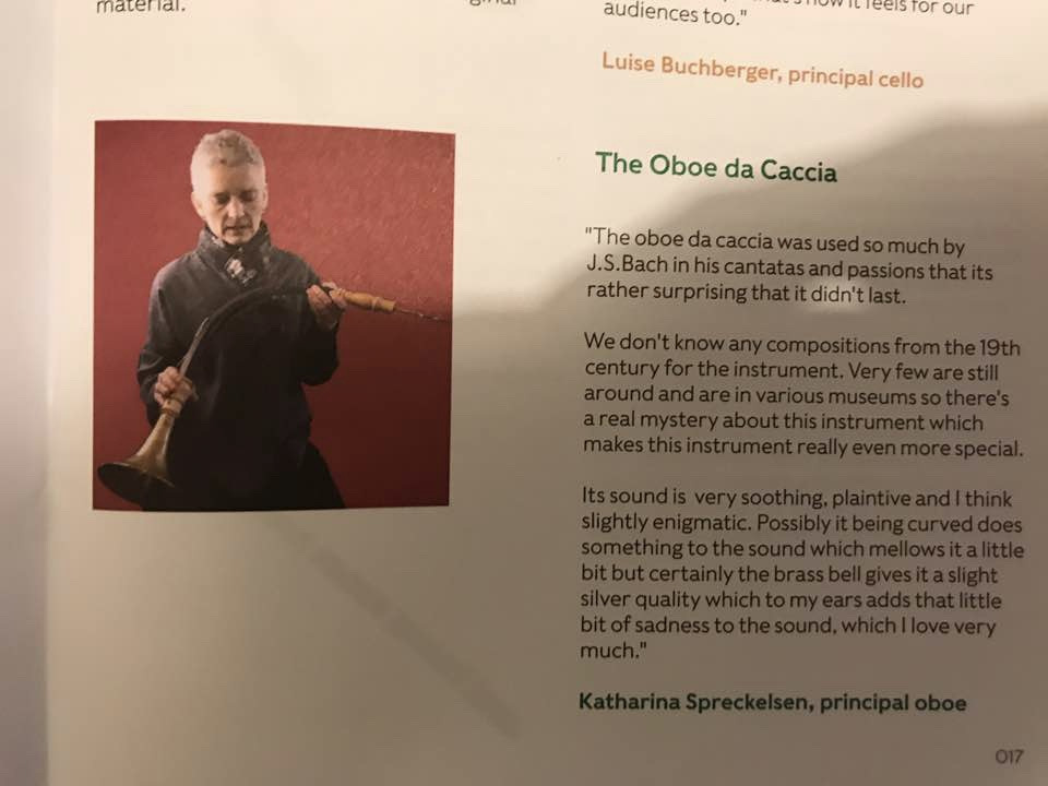 공연장 내 로열 페스티벌 홀(Royal Festival Hall)은 대부분 백발의 노인들로 가득했다. 연주가들이 악기를 들고 무대 한쪽으로 들어선다. 생전 처음 보는 악기도 있다. 바로크 시대 사용되었던 오보에(The Oboe da Caccia)이다. 현대에는 거의 사용되지 않는 악기라 한다. 무대 반쪽은 아직 텅 비어있다.