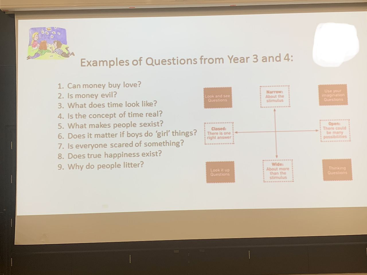 <학교 커리큘럼 데이> 발표 자료를 살펴보니 예시 질문들이 예사롭지 않다. ‘돈으로 사랑을 살 수 있을까?’, ‘돈은 악한 것인가?’, ‘시간은 어떤 모습일까?’, ‘시간의 개념은 실제로 존재하는 것일까?’, ‘무엇이 사람을 성차별적으로 만드는 걸까?’ ‘남자아이들이 여자 아이들이 하는 짓을 한다면문제가 될까?’, ‘진정한 행복이라는 것이 존재하는가?’