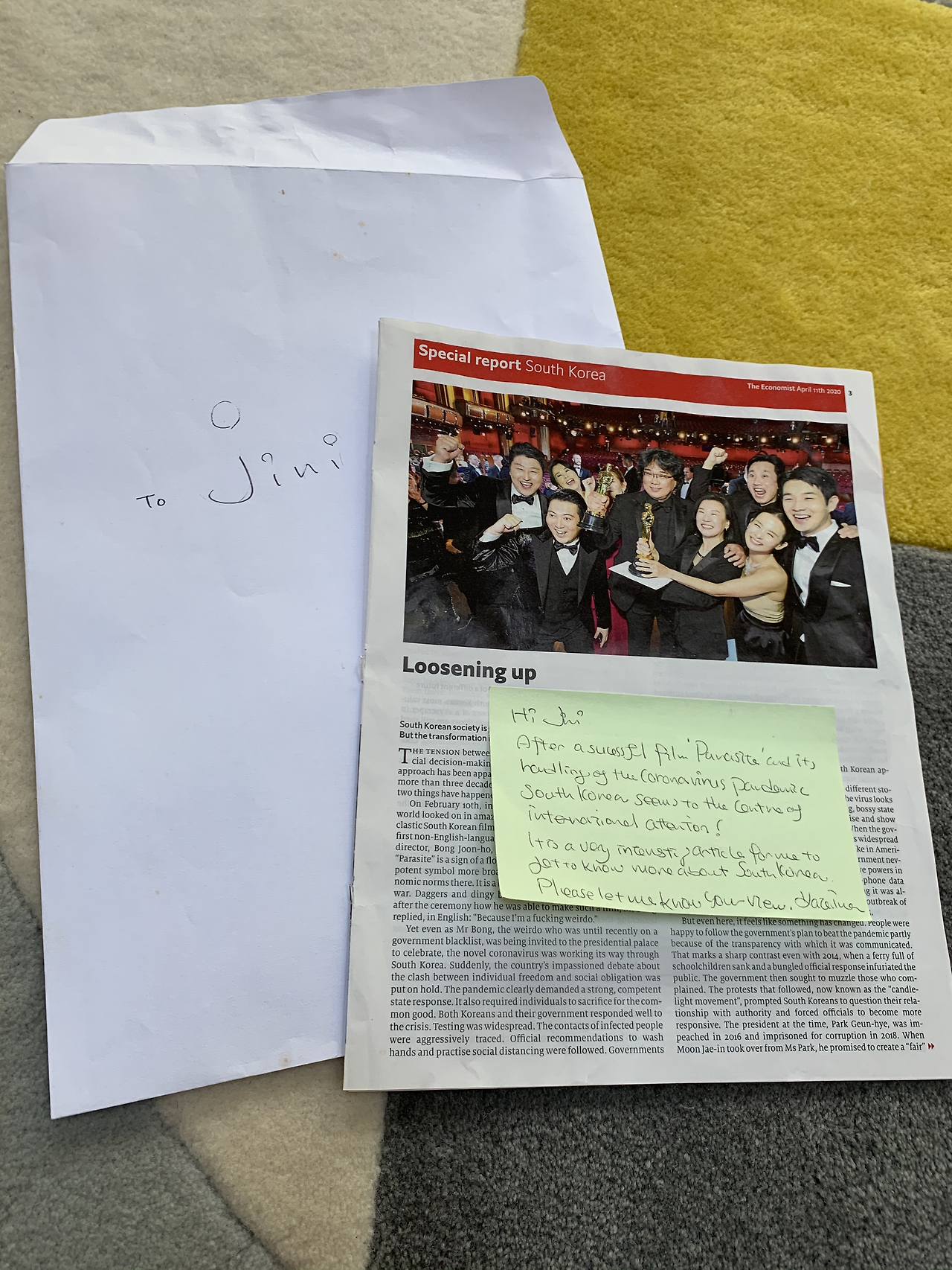 흰 봉투에 몇 페이지에 걸친 이코노미스트 코리아 스페셜 리포트가 들어있다. 쪽지에는 영화 기생충과 코로나바이러스 방역으로 한국이 세계 무대에서 새롭게 관심을 받고 있는 것 같다며 흥미롭게 기사를 읽었다고 했다. 그리고 기사에 대한 나의 생각도 듣고 싶다고 했다.