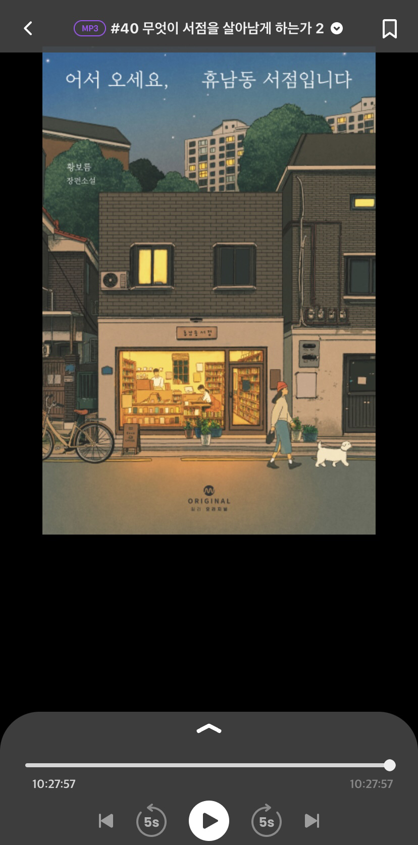최근 완독한 오디오북은 브런치와 밀리의 서재 합작인 “어서 오세요, 휴남동 서점입니다”이다. 작가는 황보름. 너무 좋은 이야기들이 많아 어쩔 줄을 모르겠다. 그냥 듣는 것만으로도 내 삶이 윤택해지는 기분이다. 오랜만에 오디오북을 듣는 것이 좋은 것인지, 오랜만에 소설을 읽는 게 좋은 것인지 어쩌면 둘 다인지도 모르겠다.