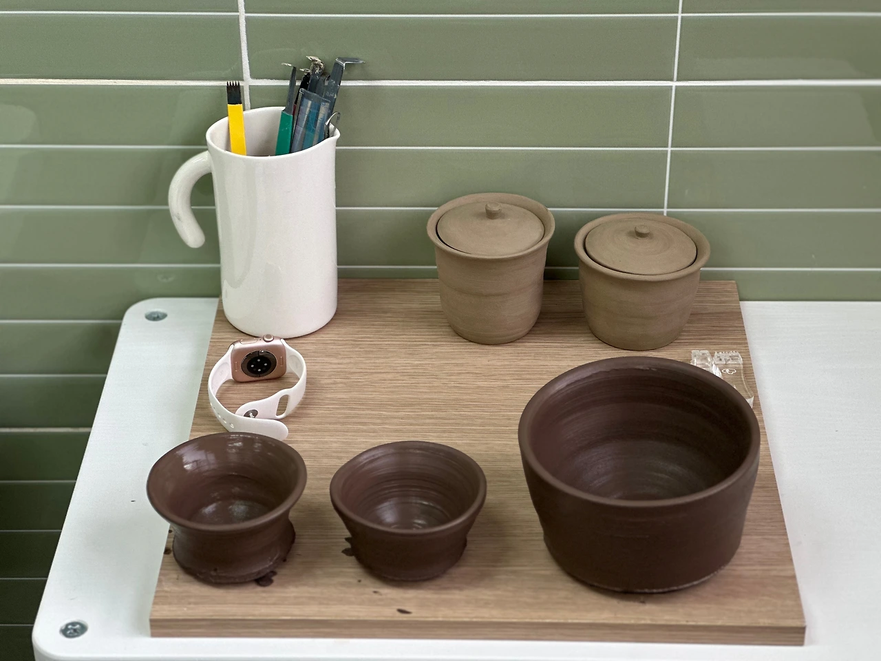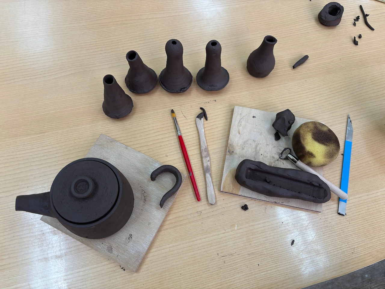주전자는 지금까지 만들었던 것 중에 가장 어려웠다. 뚜껑, 손잡이, 주둥이, 파트토 가장 많고 쓸만한 형태로 만들어야 하다 보니 그립감도 신경 써야 하는데 생각만큼 잘되진 않았다. 아직 말랑한 흙 상태에서 어떻게 붙어야 편한 각도와 모양인지 상상하기가 어렵다고 할까.. 그래도 새로운 도전이라 즐겁다.