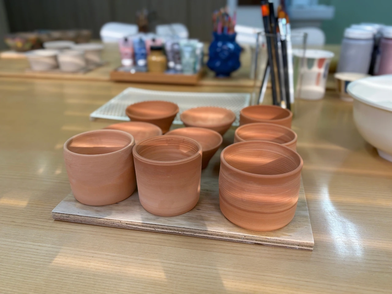 오늘은 초벌 구워진 컵들에 유약을 발랐다. 하나하나 어떤 색이 어울릴까 고민하면서 정성껏 색칠했다.