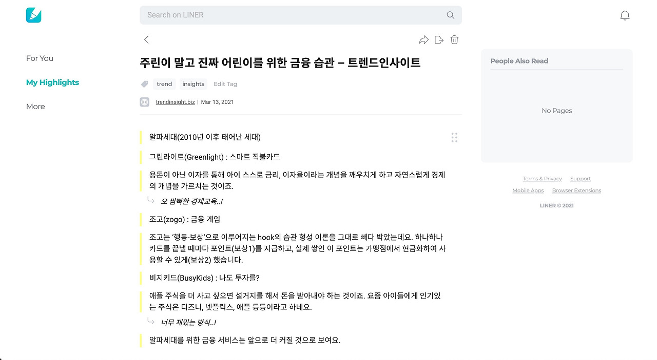 그래서 Liner를 구독한 이후에는 웹서핑 중에 마음에 드는 글이 있을 때 바로 라이너에 저장해 두고, 나중에 시간이 생겼을 때 하이라이트와 코멘트 기능을 이용해서 읽는 편이에요. 그렇게 읽고도 정말 중요한 파트가 있다면 Notion에 따로 정리해둡니다. Liner는 하이라이팅 기능에 포커스하고 있다 보니 Tag기능으로 1차적인 분류는 가능하지만 나중에 필요한 정보를 바로바로 찾아보기는 조금 어려울 수 있어요.