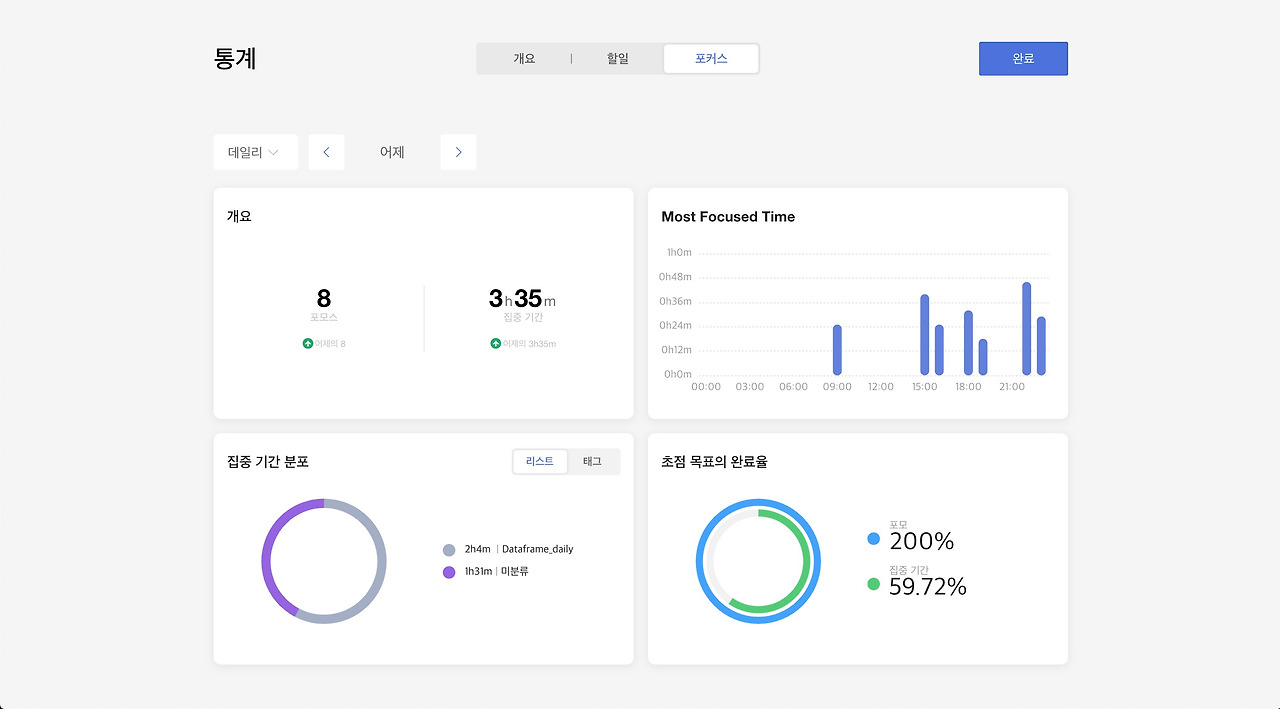 포모도로 타이머 기능이 있어서 시작하면 시간이 바로 카운트다운돼요. 사소해 보이지만 상단 바에서 줄어드는 시간을 보며 집중할 수 있어요.
