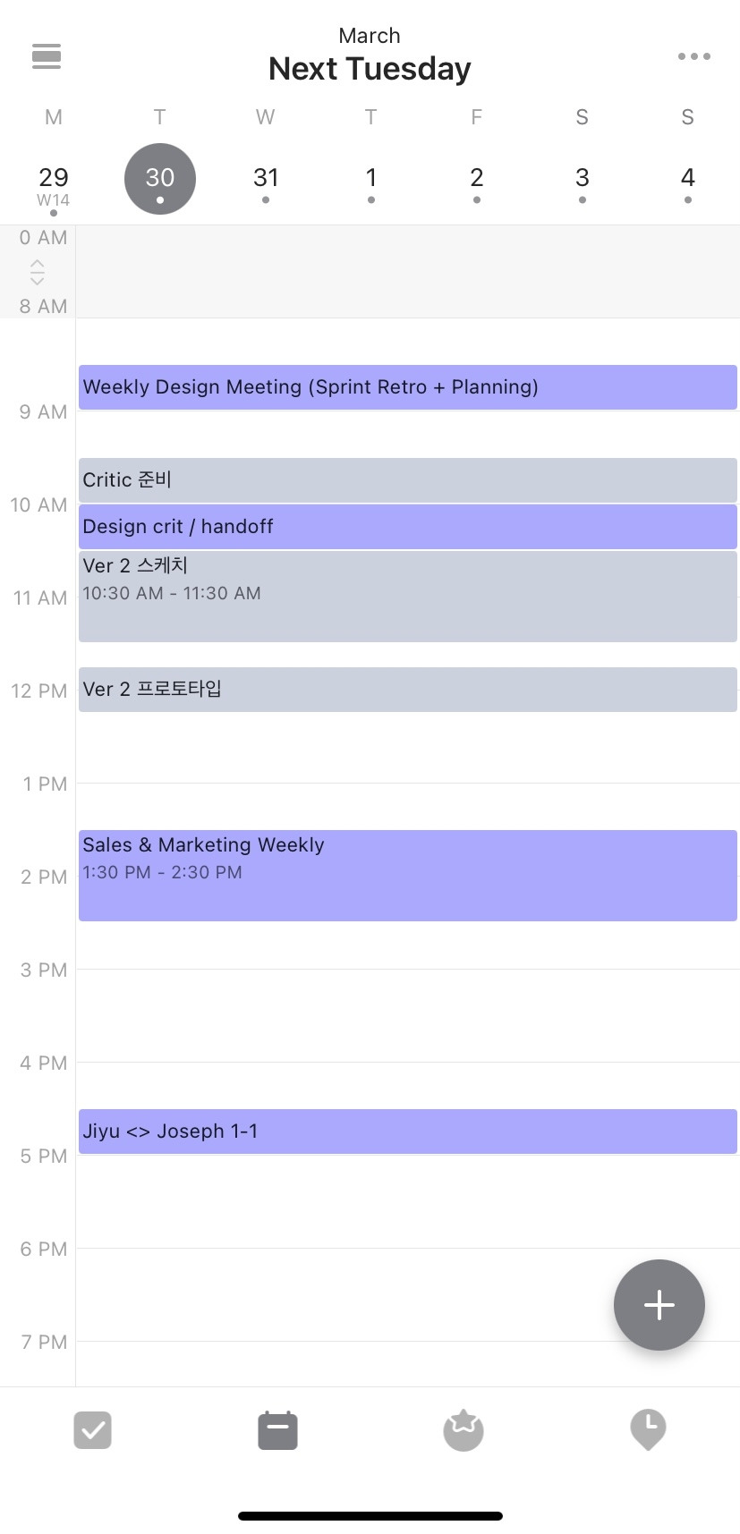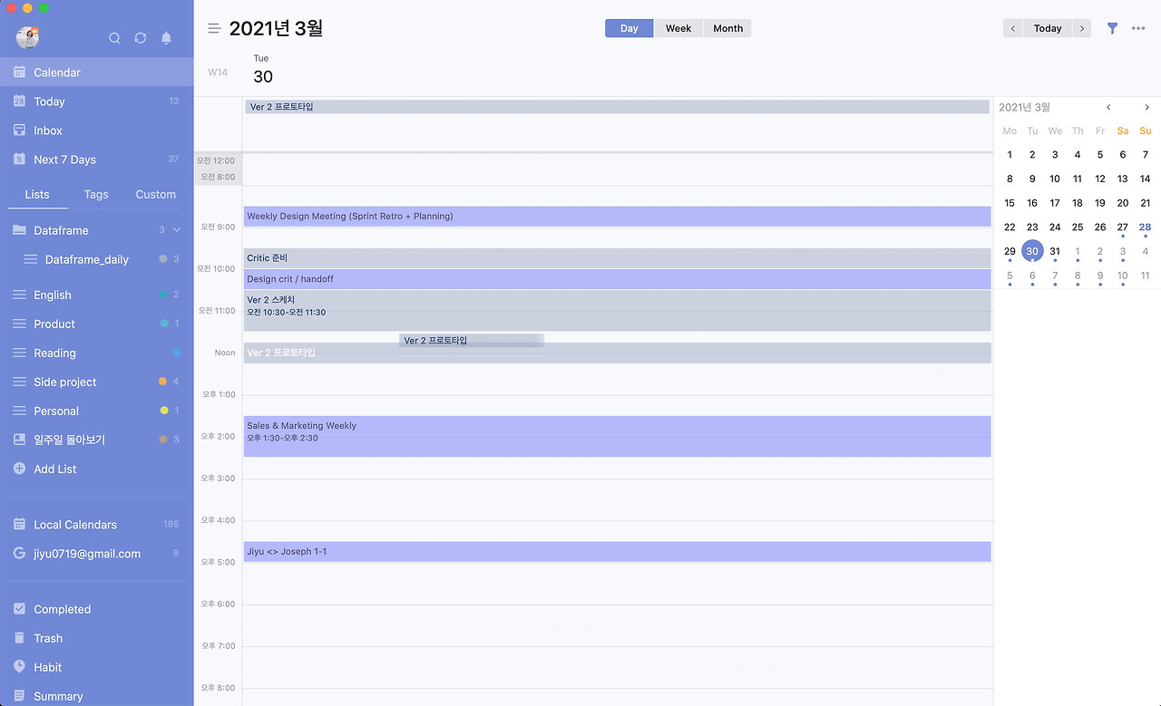 캘린더 기반으로 그날의 스케줄을 확인하고 남은 시간에 타임블록을 지정해 할 일을 넣을 수 있다는 점이 가장 좋았어요. 이게 가장 제가 원했던 기능이에요. 미팅이나 일정이 없는 시간에 그날 해야 할 일을 미리 배치하고 시간 내에 끝내는 습관을 만들고 싶었거든요.
