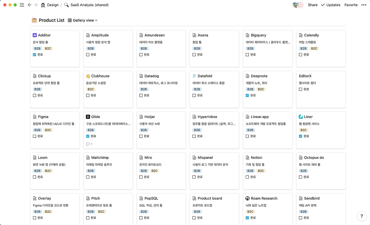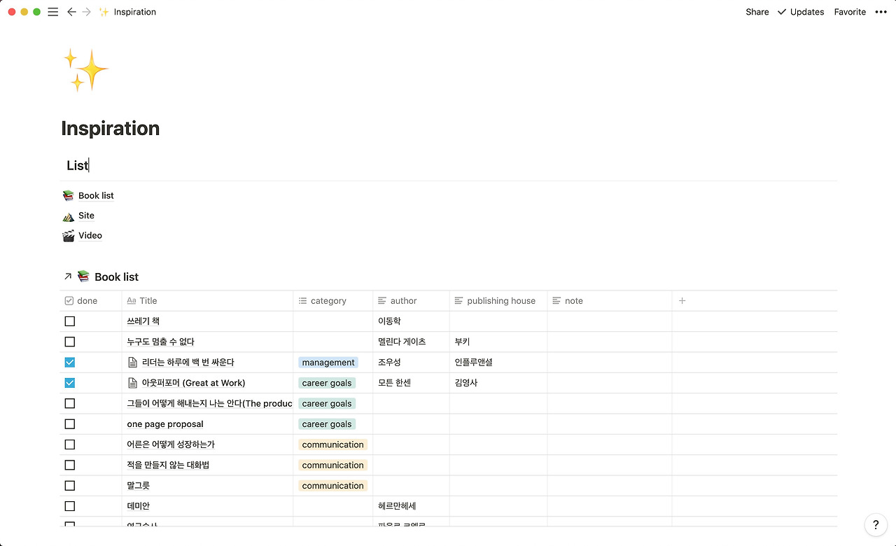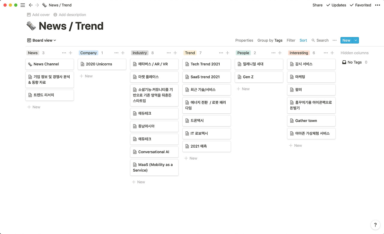 뉴스/트렌드는 보드 뷰를 이용해서 태그로 분류하고, 프로덕트 리스트는 갤러리 뷰를 이용해서 많은 프로덕트를 한눈에 볼 수 있게 정리해요. 또 인스퍼레이션 같은 경우는 테이블을 이용해서 책, 장소, 비디오 링크를 정리합니다.