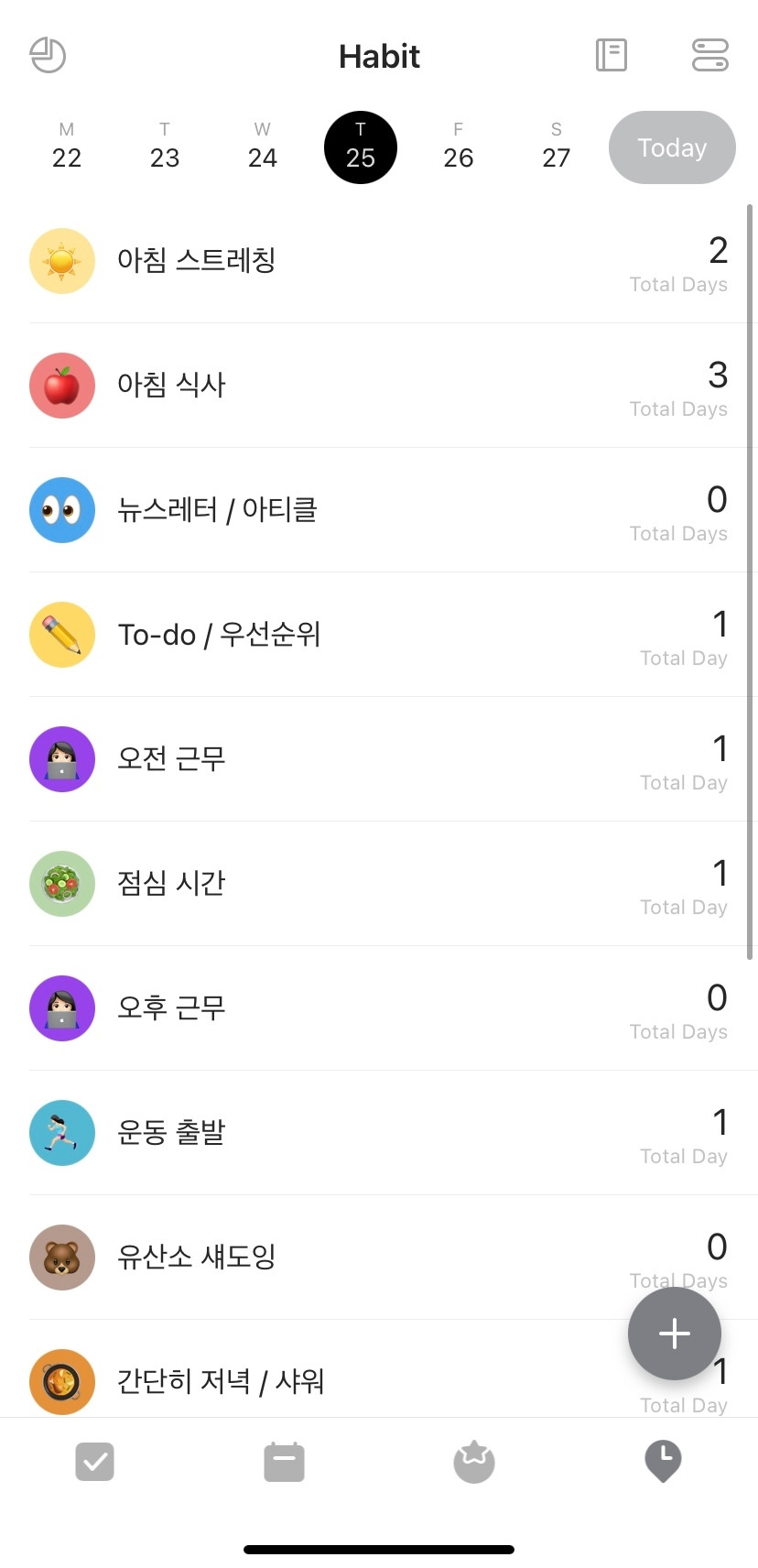 이렇게 매일 다른 투두가 아닌 습관으로 만들고 싶은 루틴이 있다면 습관 탭에서 따로 만들고 요일을 지정할 수 있고 필요하면 시간 알람을 설정할 수 있어요. 그럼 데스크톱과 모바일 앱 둘 다 알림이 옵니다.